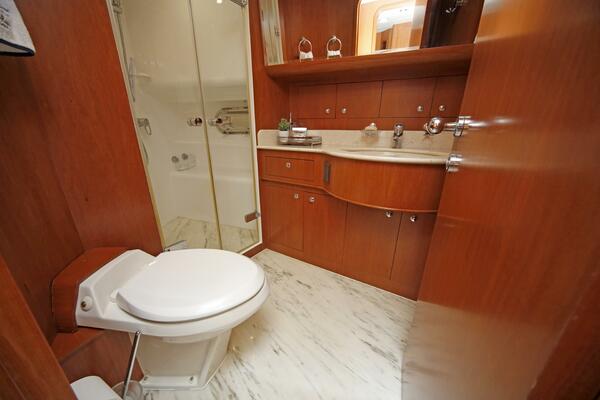 The spacious forward head serves both the forward VIP and the starboard side guest cabin. There are two entrances, one from the VIP and the other from the companionway. The sole is a marble slab with a contrasting border. The bow front vanity has storage below, an under-mount china sink below a marble countertop. A medicine cabinet and oval porthole with a weather cover is above. There is a Hunter Royal Flush Head, and the stall shower has two clear glass doors, a light, and an exhaust blower. Also in the head are three overhead halogen lights.