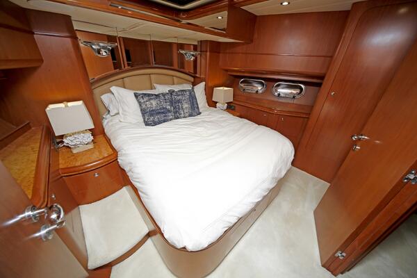 Located centerline of the yacht, this cabin offers maximized beam, a quiet and stable ride, and the highest level of fit and finish. Entering from the forward end, there is a king-size berth on the centerline with rope lighting and abundant storage below.