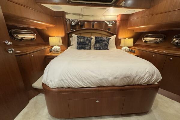 To port is additional cabinetry and several drawers. The portholes in the master are customer-enlarged vertical ovals with stainless steel weather covers. Also in the master stateroom are several overhead halogen mini spots, two overhead stereo speakers, a smoke detector, digital Marine Air A/C controls, and accent rope lighting.