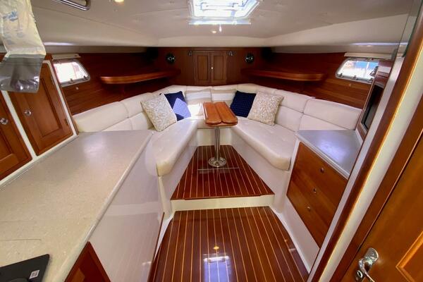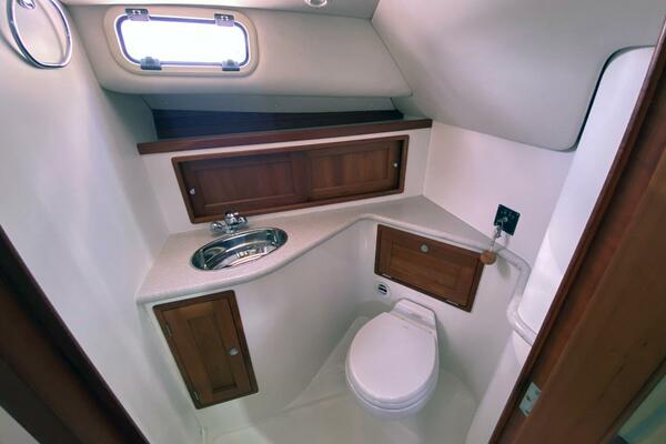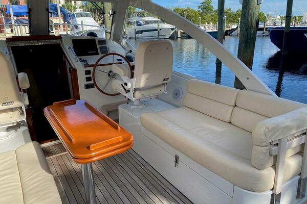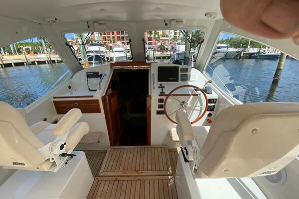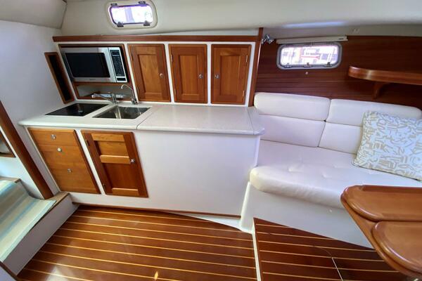 Cockpit with aft bench seating. Port and starboard bench seating at midship. Twin Stidd helm chairs. Nicely appointed helm to starboard. Below deck the Galley is to port. A Vee berth forward. Head is to starboard.
