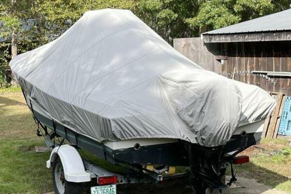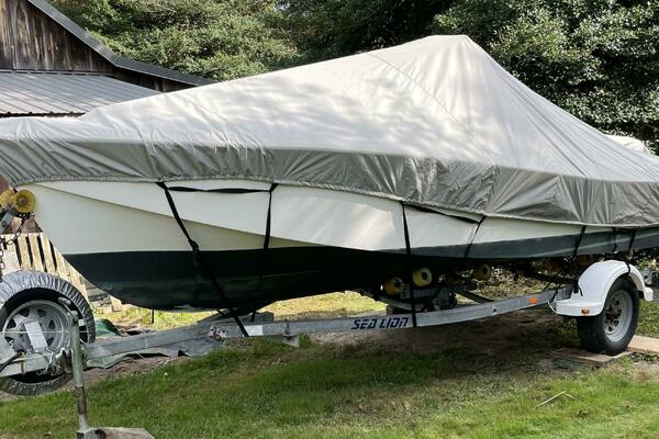 Includes a blue bimini top, full canvas boat cover, and numerous spare accessories. Trailer has been well kept and is in excellent condition. Solid fiberglass hull and closed cell foam topsides, transom, and stringers. Entirely wood-free construction. Stored inside every winter. Turn key for the next owner.