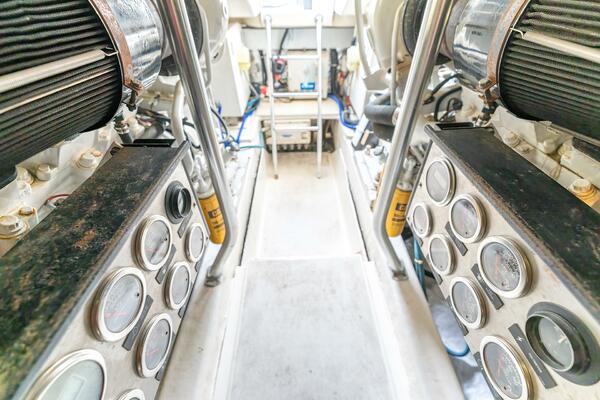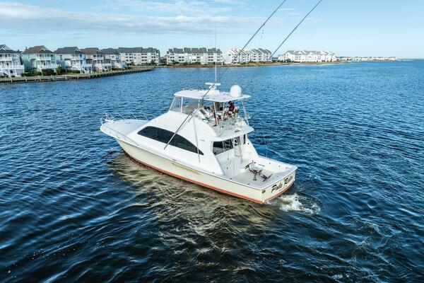 Powered by CAT C18s with 610 hours, which are contained in a spacious engine room that allows for easy access to equipment, battery boxes, engine room wiring, genset, and other gear. The helm console is comfortable in width for all your electronics, and there's lots of seating forward with stowage areas beneath. The 144-square-foot cockpit, which, as you'd expect, has all the requisite standard equipment for a great day fishing.