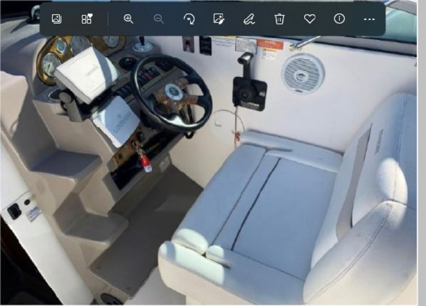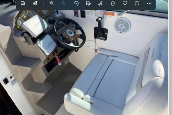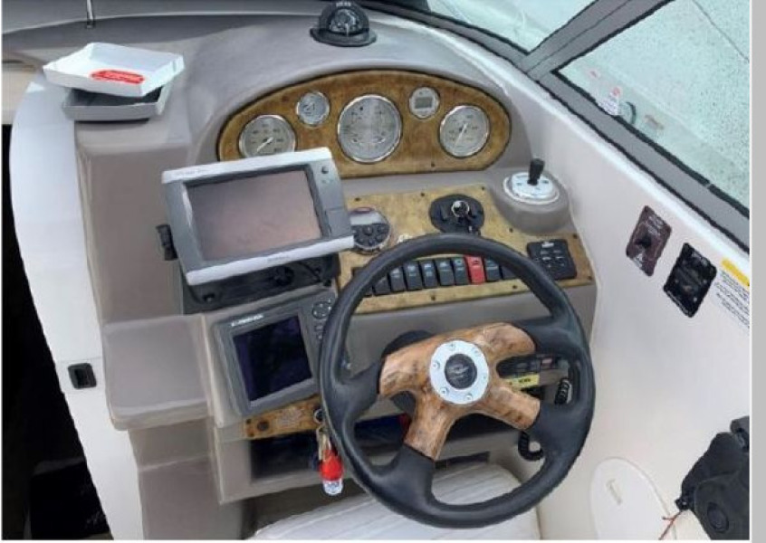 Her roomy cockpit is on a single level featuring a convenient and safe walk-through windshield, burlwood dash, electric engine hatch, full camper canvas. At the helm, she is equipped with GPS and a bow thruster which will help make docking a breeze. The current owner has installed new batteries and had the gimble bearings serviced this past season. She will be professionally serviced & commissioned and ready to go this Spring.