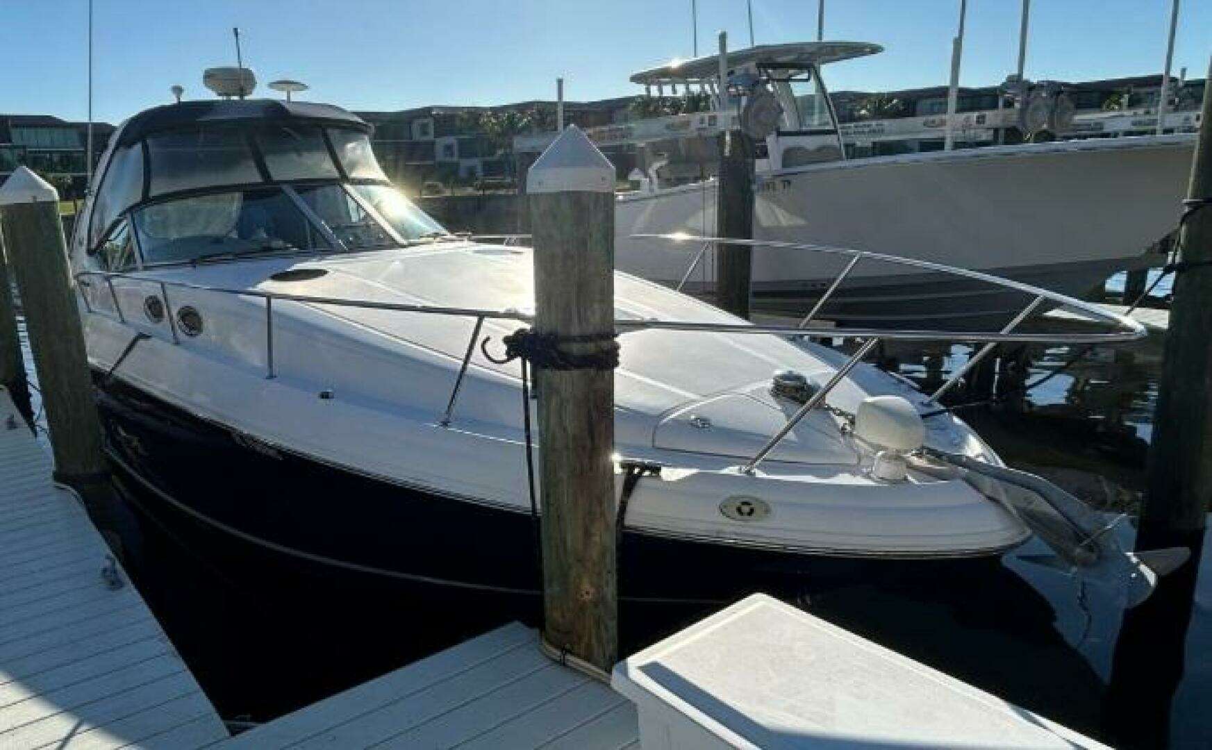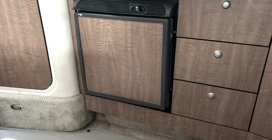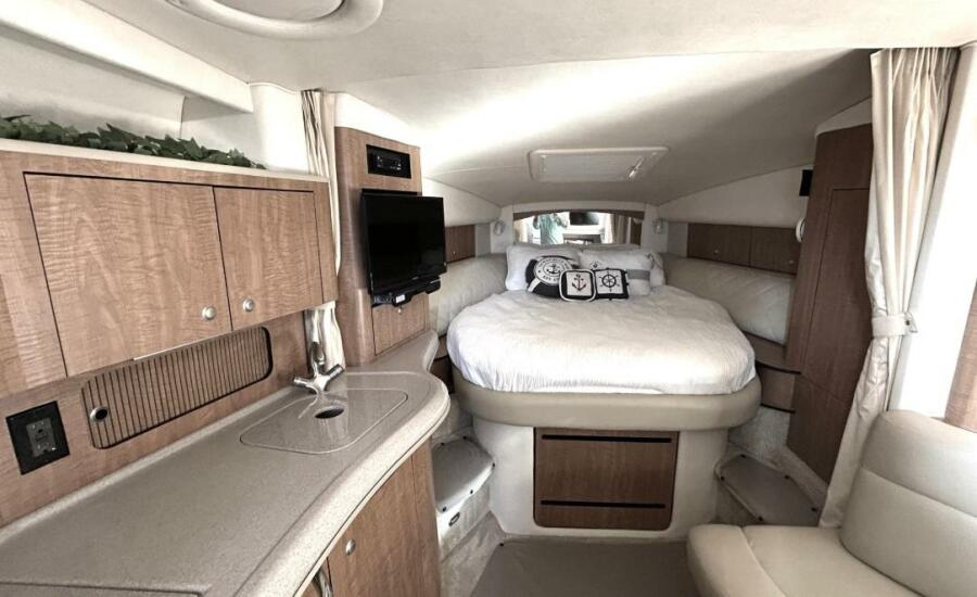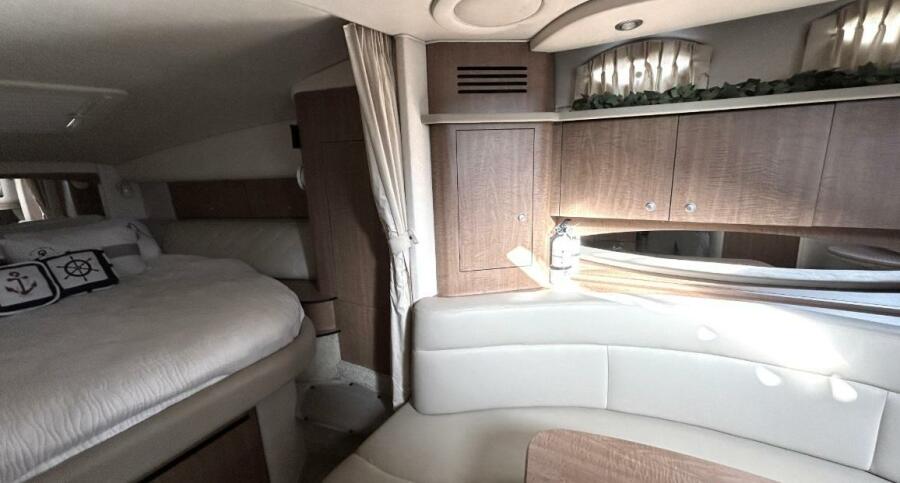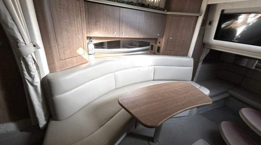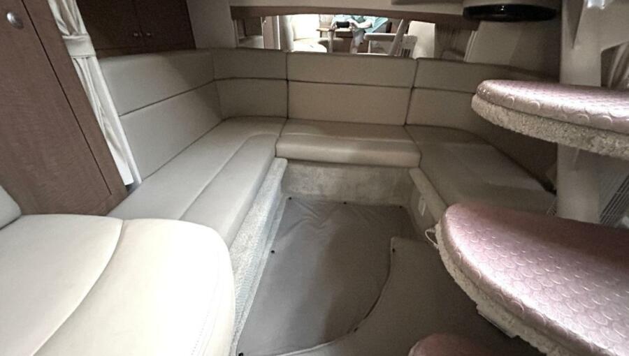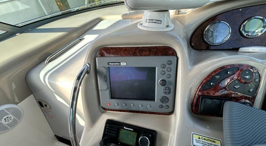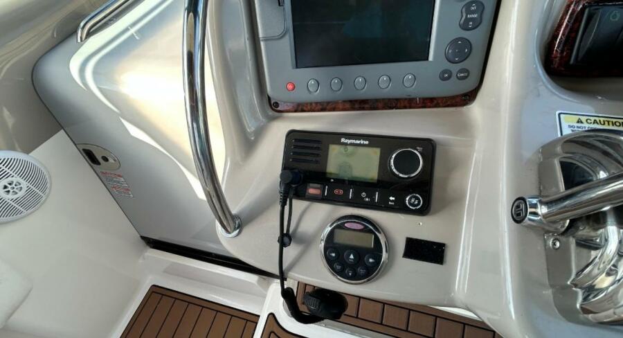 There's nothing quite like the exhilarating profile of this sleek 320 Sundancer. Its dramatic lines and bold colors make everything else look like it's sitting still. Exciting features include cockpit wet bar with Corian counter, extra-wide bench-style helm seating with two flip-up thigh-rise bolsters, optional underwater swim platform lighting, premium cabin surround sound, and lots more.