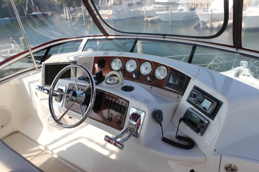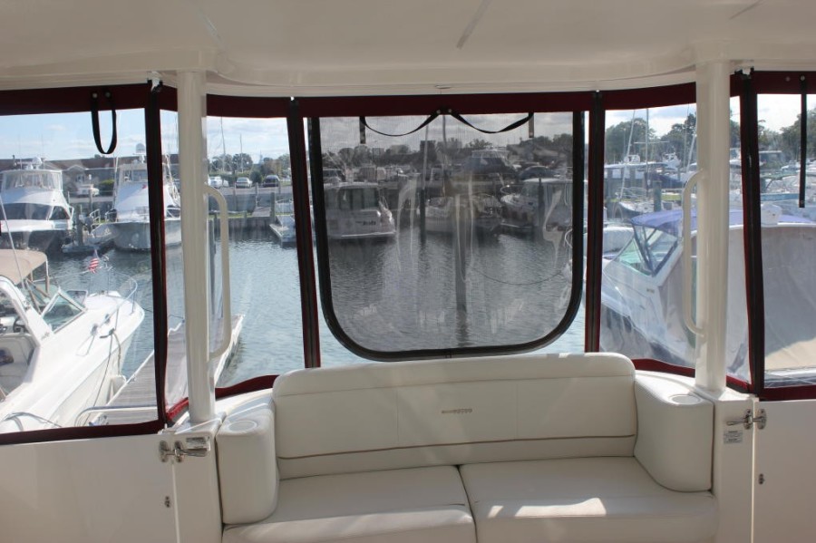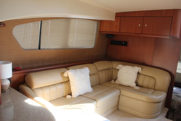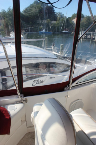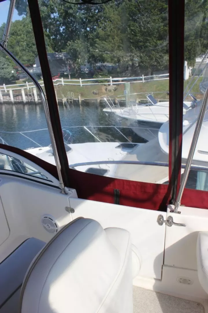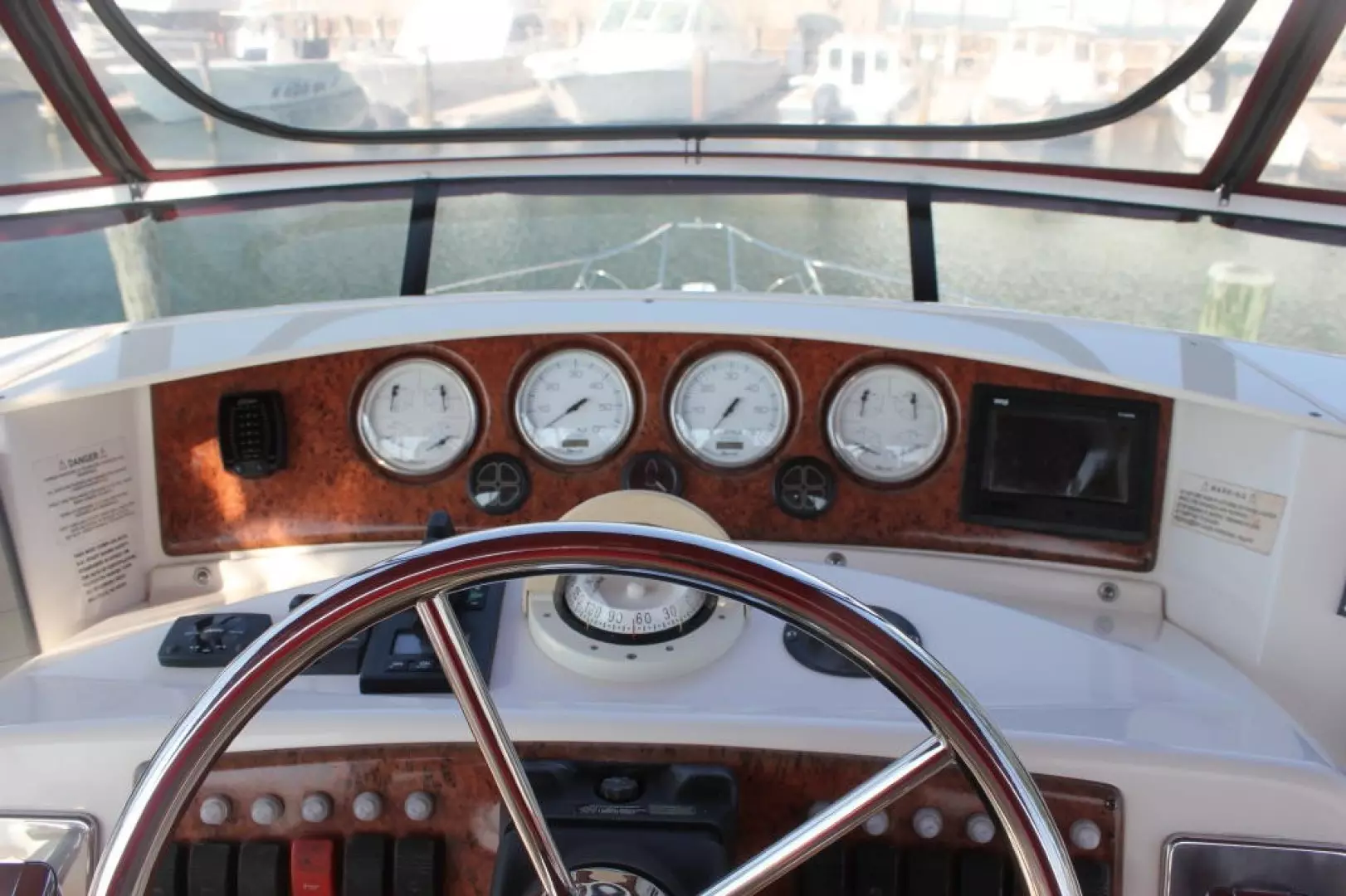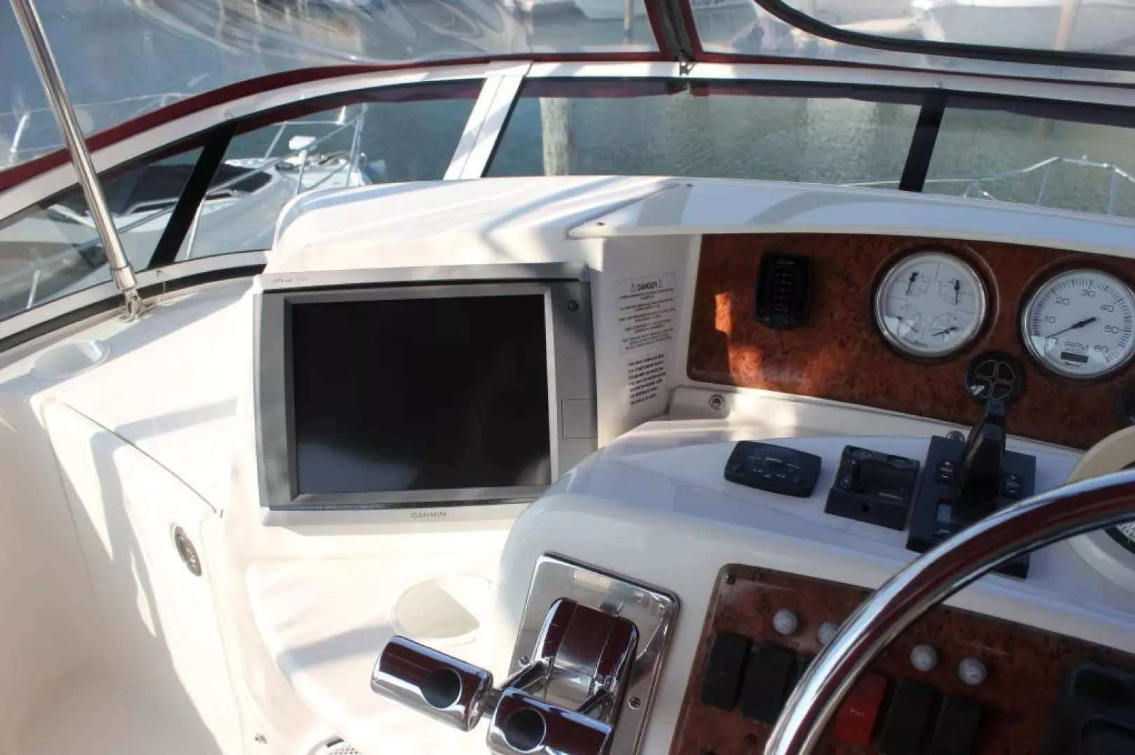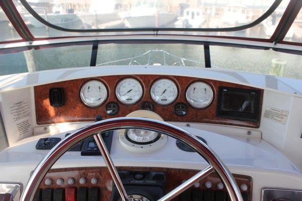 Our Wine Knot could be your home on the water!! Elevated side decks result in a huge salon/galley/dinette area which is tastefully finished with satin cherry cabinets, Corian counters, and synthetic leather furnishings. The full-service galley, a step down from salon, has a serving counter, generous storage and hardwood flooring. The aft master stateroom has a walkaround queen bed and separate shower and toilet stalls along the port bulkhead, and the forward stateroom also has queen bed and private access to the second day head. The aft deck has a hardtop, bench seat, and wet bar. She is equipped with T-380 HP Crusader 8.1 HO engines with 182 hours, a 10 kW Kohler genset with 210 hours and bow and stern thrusters. She is in her slip in Greenport NY and ready for her next owner. Call for an appointment for a viewing.
