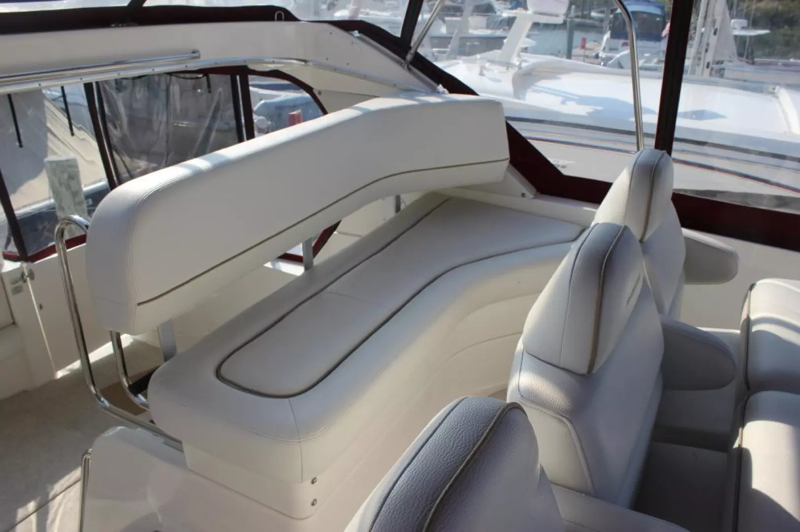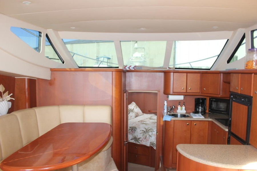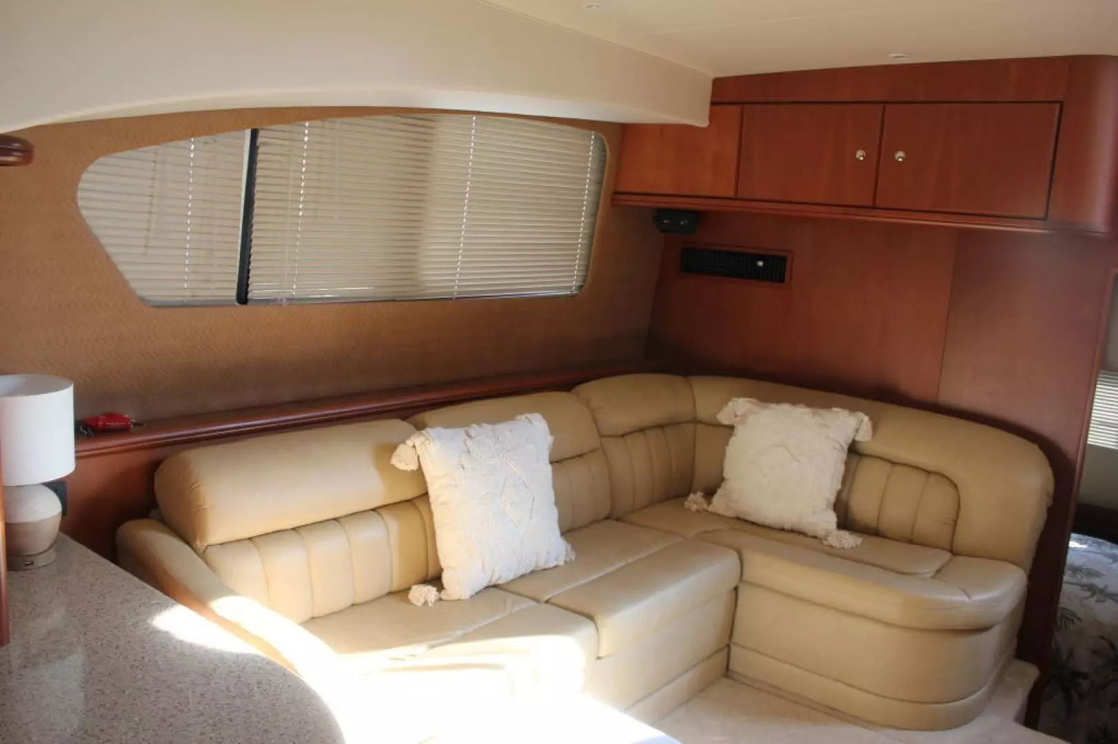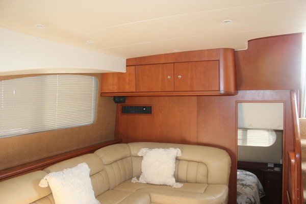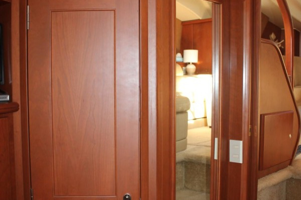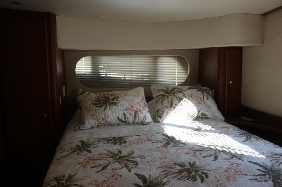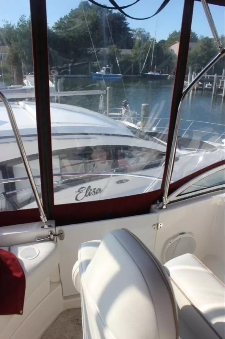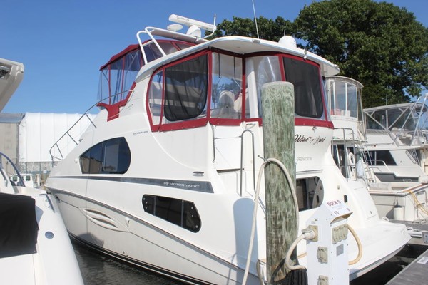 Our Wine Knot could be your home on the water!! Elevated side decks result in a huge salon/galley/dinette area which is tastefully finished with satin cherry cabinets, Corian counters, and synthetic leather furnishings. The full-service galley, a step down from salon, has a serving counter, generous storage and hardwood flooring. The aft master stateroom has a walkaround queen bed and separate shower and toilet stalls along the port bulkhead, and the forward stateroom also has queen bed and private access to the second day head. The aft deck has a hardtop, bench seat, and wet bar. She is equipped with T-380 HP Crusader 8.1 HO engines with 182 hours, a 10 kW Kohler genset with 210 hours and bow and stern thrusters. She is in her slip in Greenport NY and ready for her next owner. Call for an appointment for a viewing.