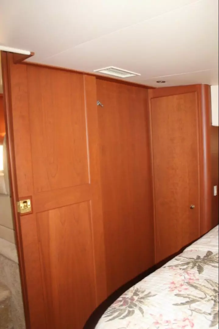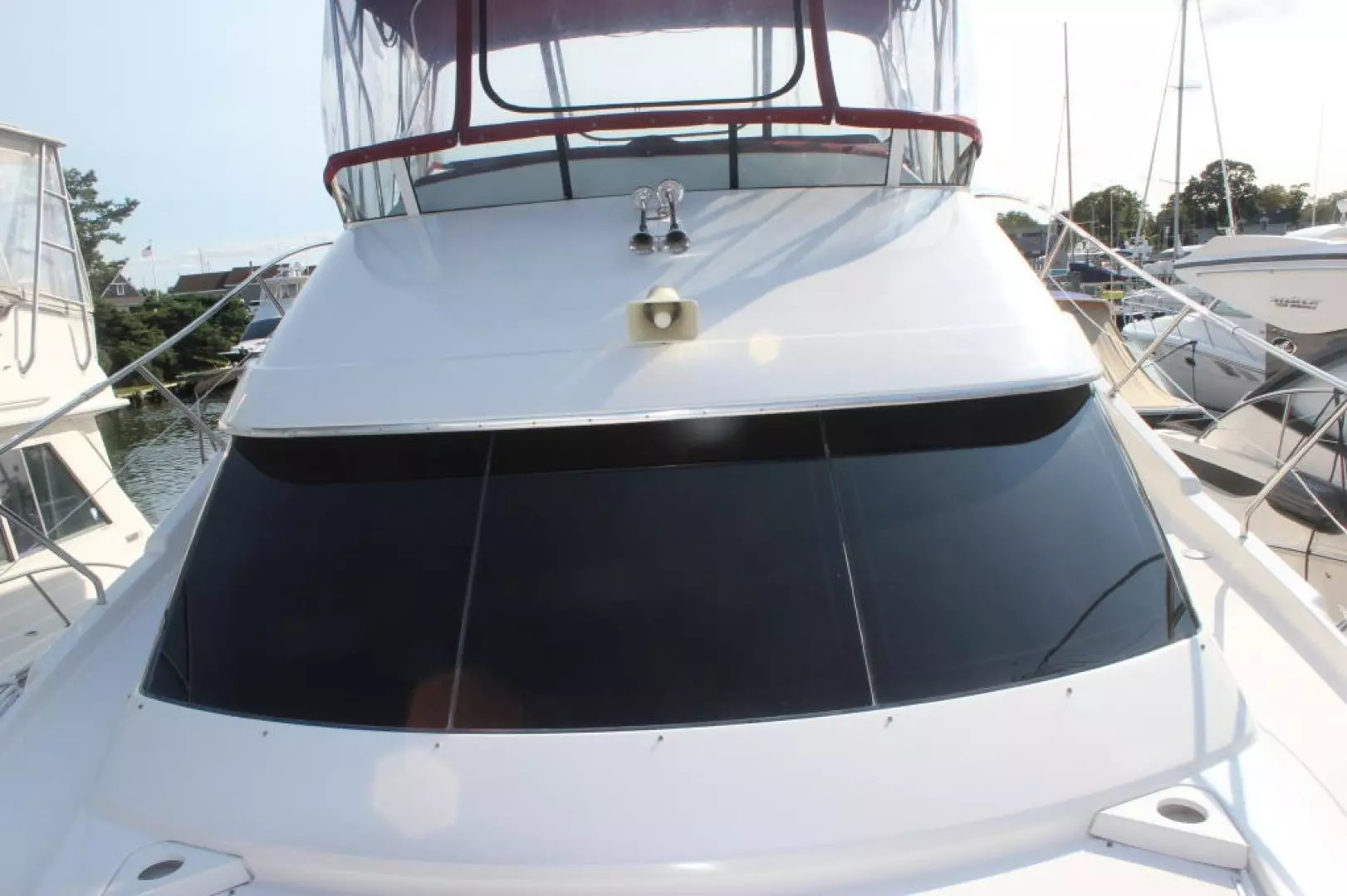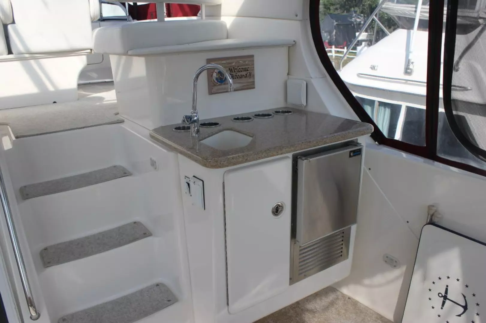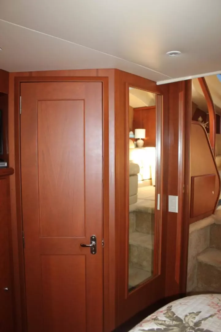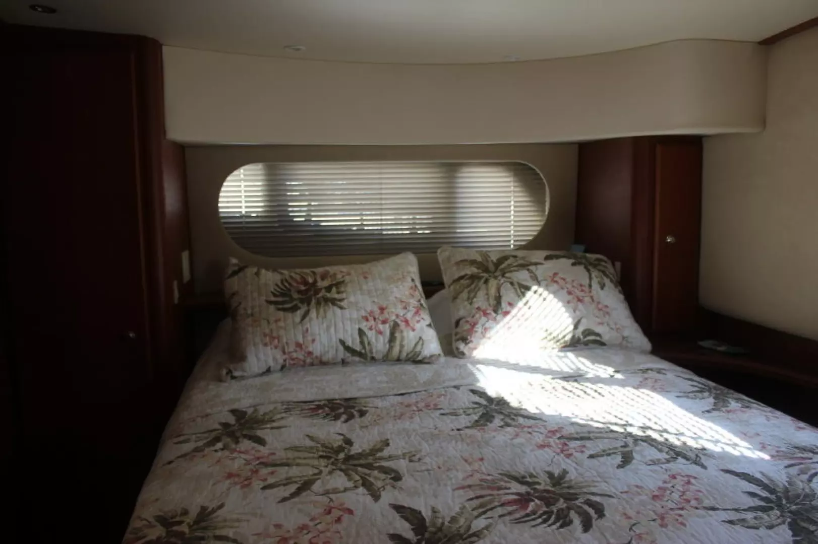 Our Wine Knot could be your home on the water!! Elevated side decks result in a huge salon/galley/dinette area which is tastefully finished with satin cherry cabinets, Corian counters, and synthetic leather furnishings. The full-service galley, a step down from salon, has a serving counter, generous storage and hardwood flooring. The aft master stateroom has a walkaround queen bed and separate shower and toilet stalls along the port bulkhead, and the forward stateroom also has queen bed and private access to the second day head. The aft deck has a hardtop, bench seat, and wet bar. She is equipped with T-380 HP Crusader 8.1 HO engines with 182 hours, a 10 kW Kohler genset with 210 hours and bow and stern thrusters. She is in her slip in Greenport NY and ready for her next owner. Call for an appointment for a viewing.