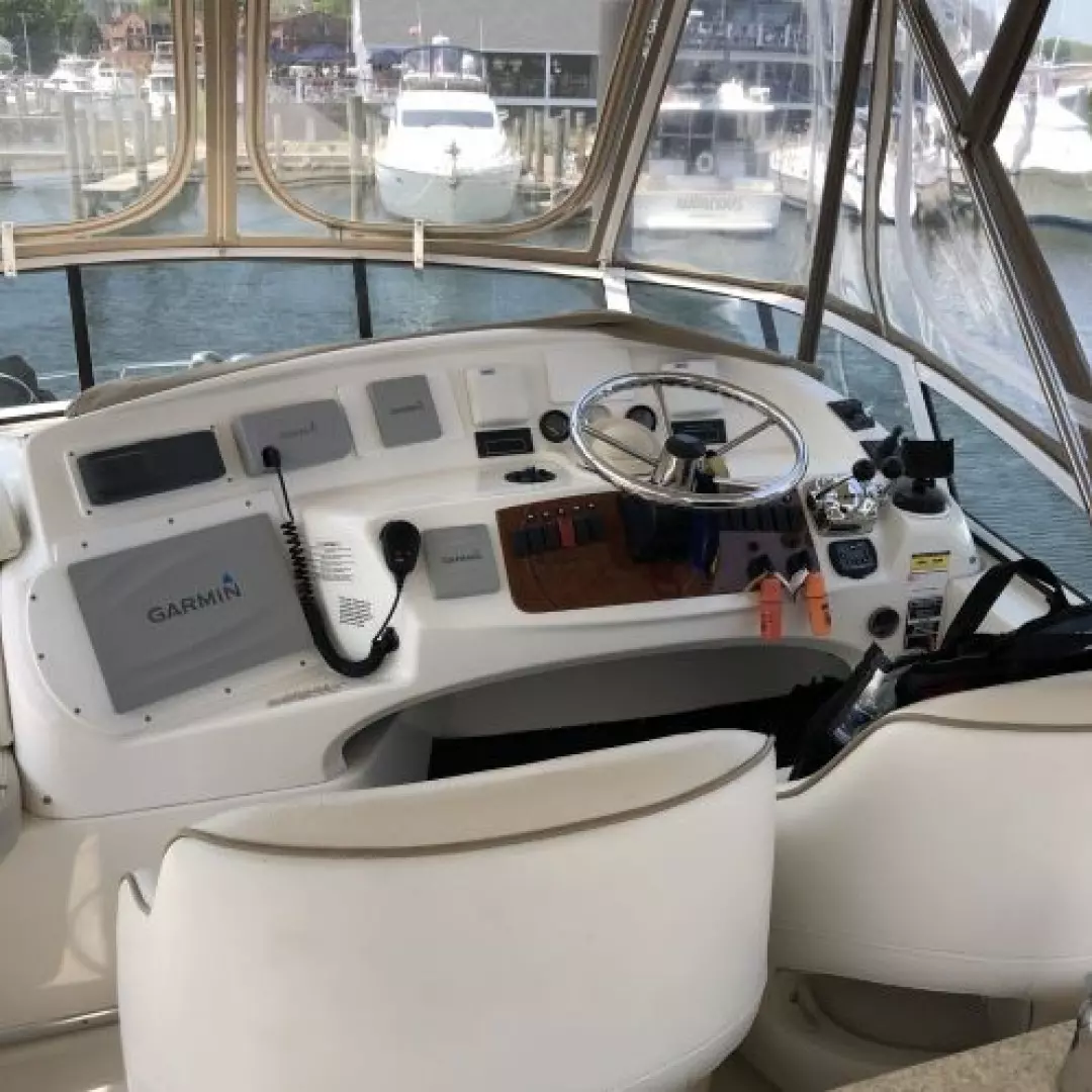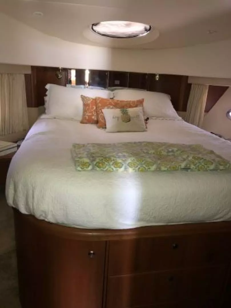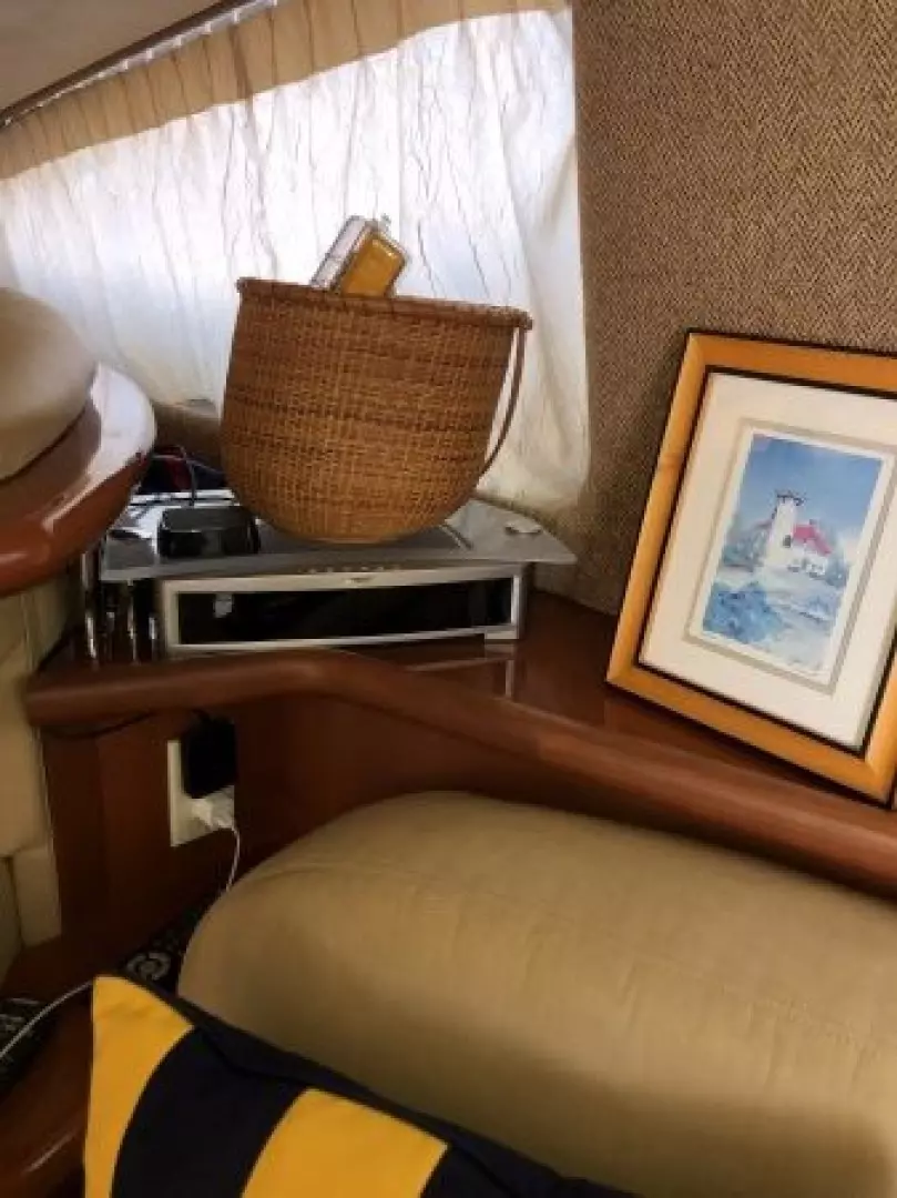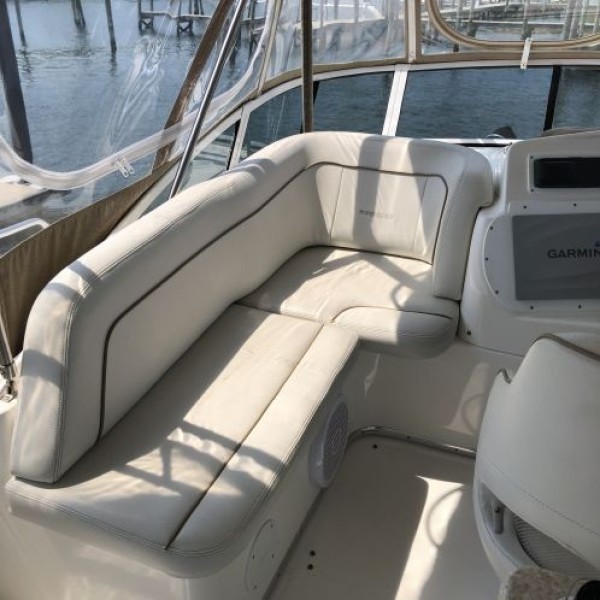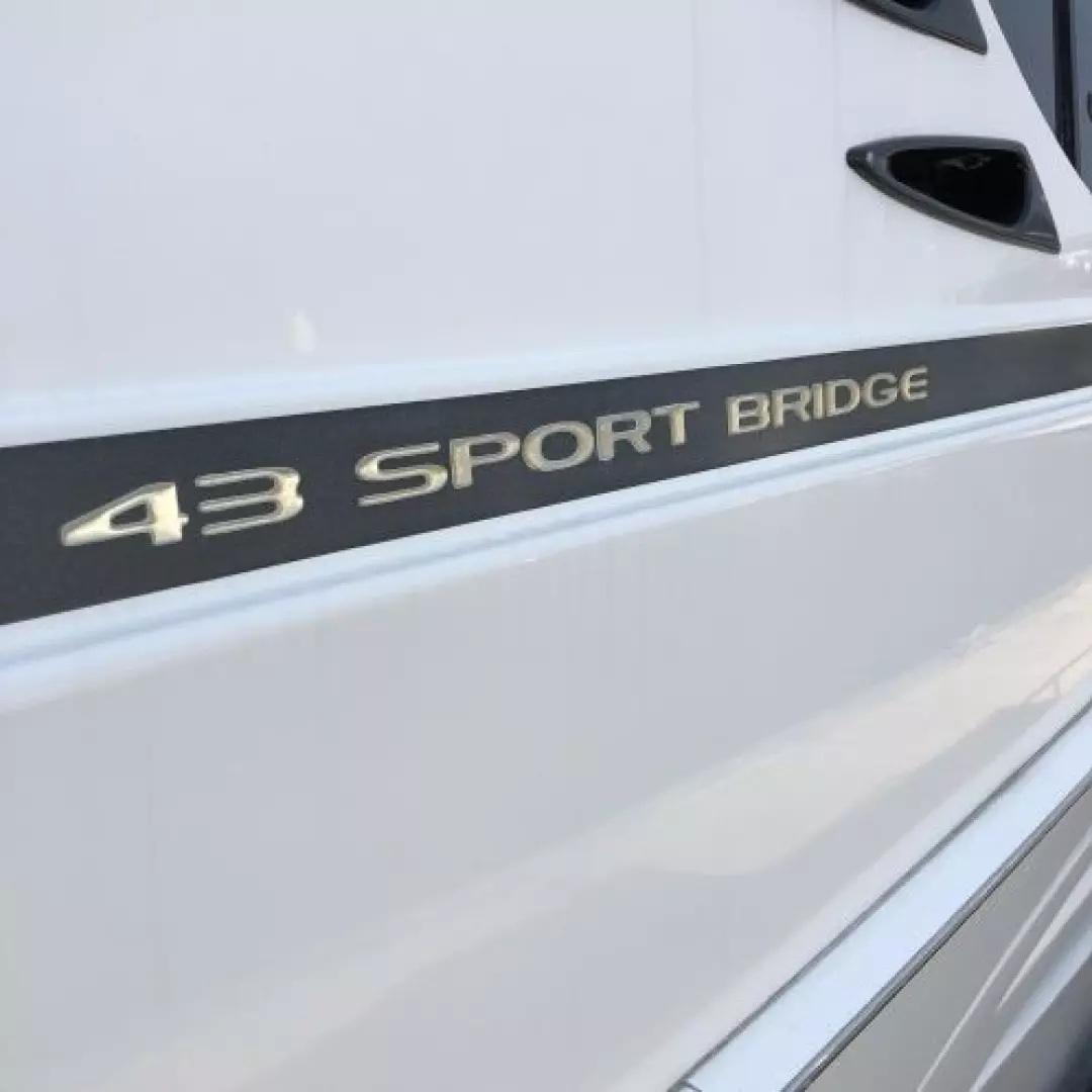 The 43 Sport Bridge ~ Lady J~ boasts one of the largest flybridges of any boat in her class. With her ample seating and wide foredeck, her spacious bridge provides all the room and comfort you need to cruise and entertain in style. Silverton's SideWalk, a unique set of molded steps connecting the bridge to the foredeck, makes access between both safe and convenient whether you're underway, anchored or handling lines. Inside, you'll discover two private staterooms and two full heads complemented by a plush salon finished in fine cherry wood and a full-amenity galley. A wealth of additional features like solid Corian countertops, designer fabrics and a 20" flat-screen TV provide you comfort aboard this beautiful Sport Bridge!