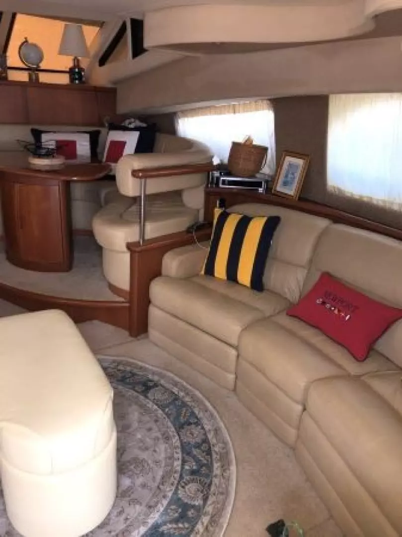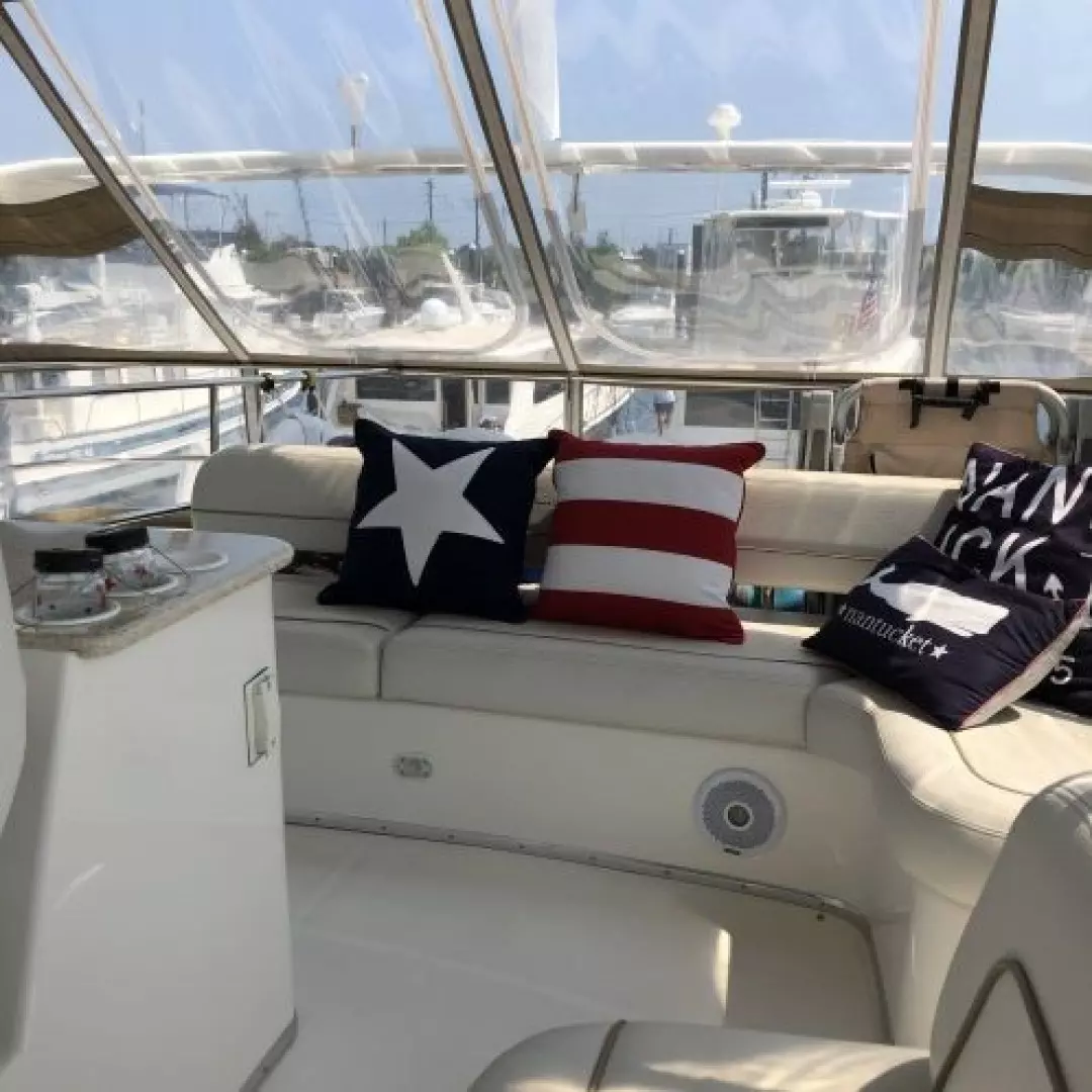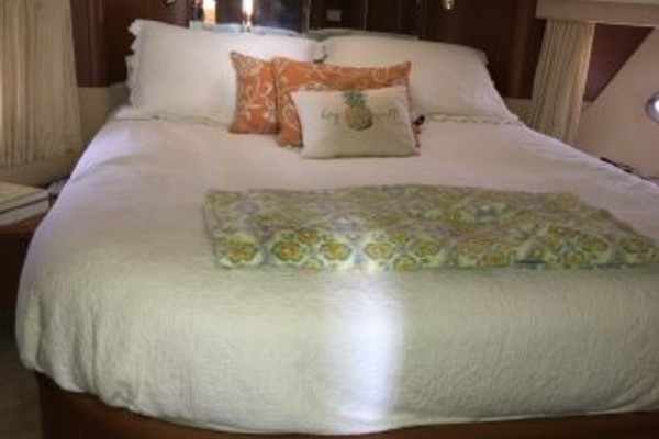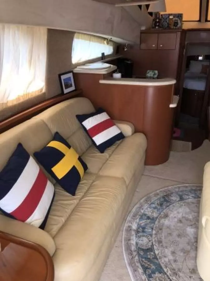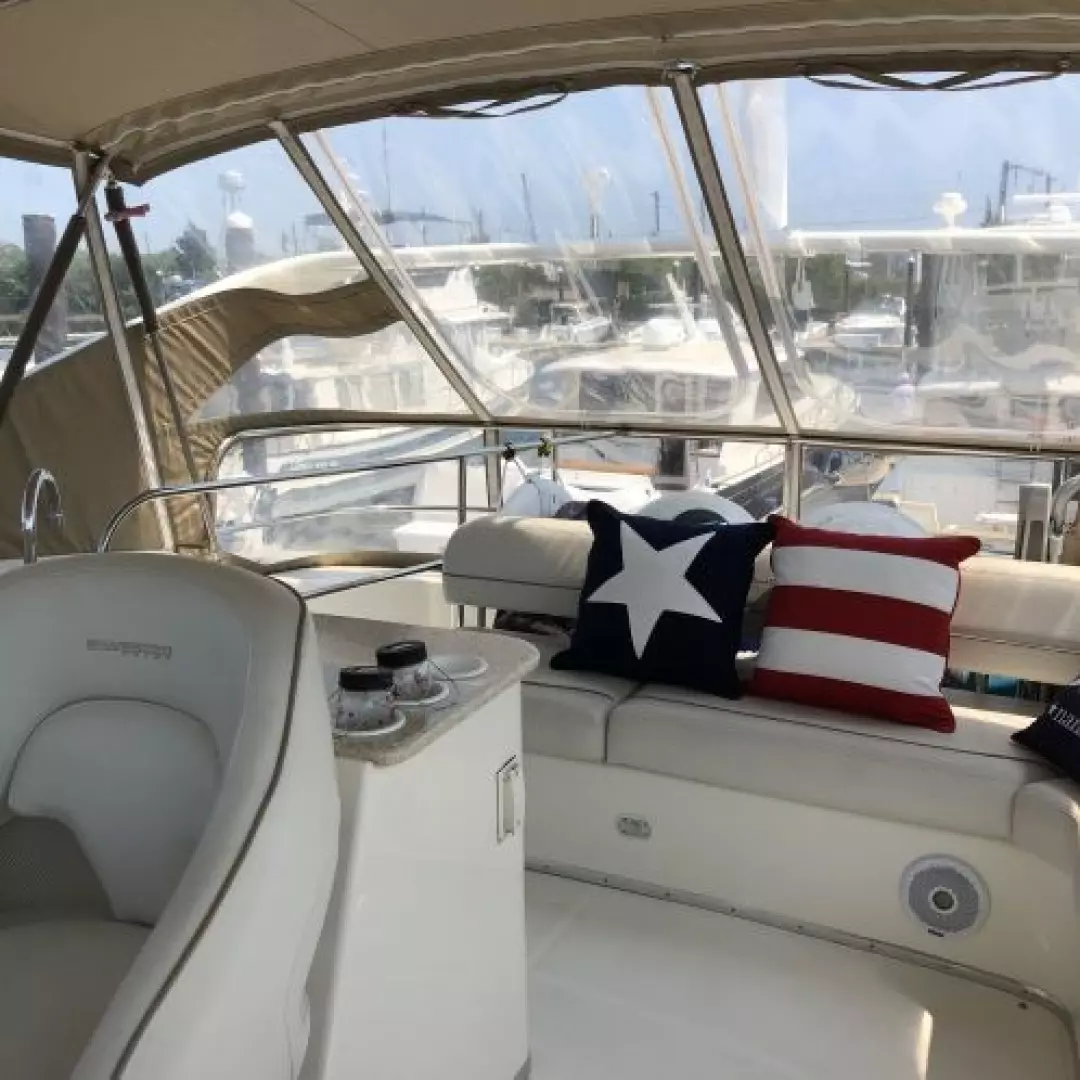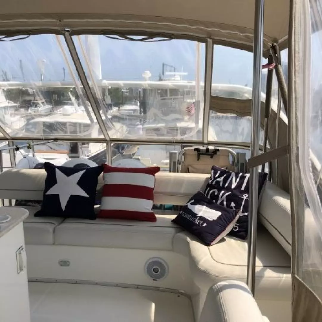 The 43 Sport Bridge ~ Lady J~ boasts one of the largest flybridges of any boat in her class. With her ample seating and wide foredeck, her spacious bridge provides all the room and comfort you need to cruise and entertain in style. Silverton's SideWalk, a unique set of molded steps connecting the bridge to the foredeck, makes access between both safe and convenient whether you're underway, anchored or handling lines. Inside, you'll discover two private staterooms and two full heads complemented by a plush salon finished in fine cherry wood and a full-amenity galley. A wealth of additional features like solid Corian countertops, designer fabrics and a 20" flat-screen TV provide you comfort aboard this beautiful Sport Bridge!