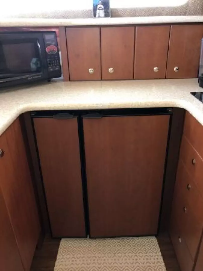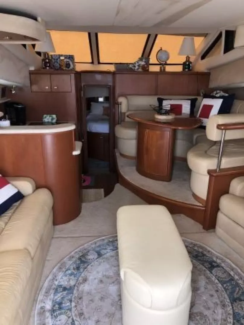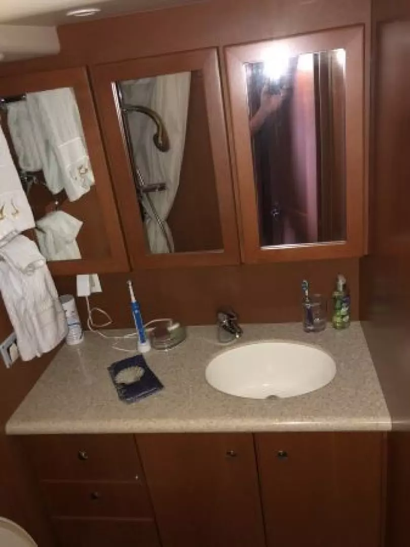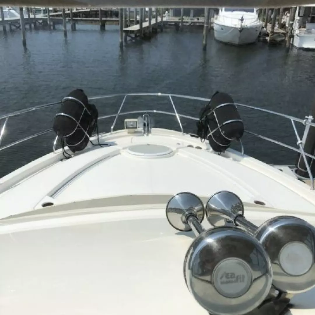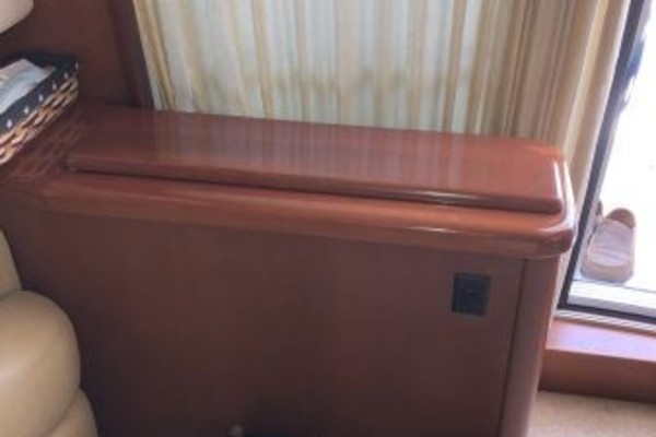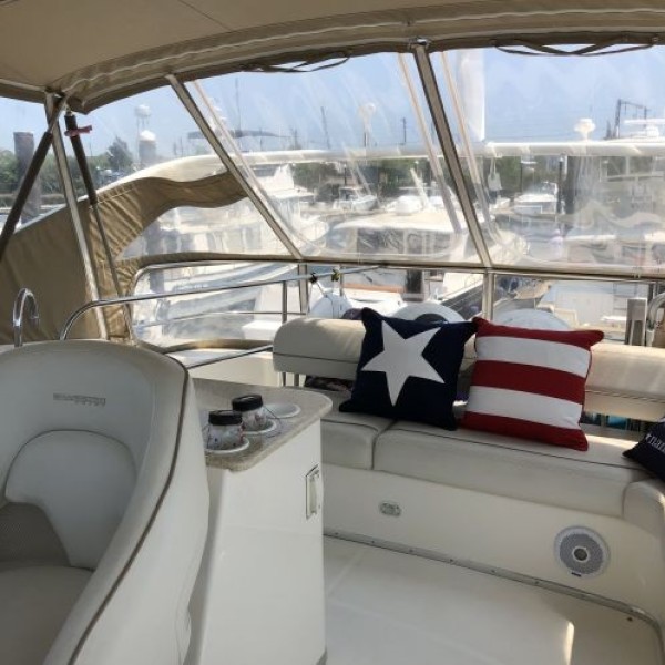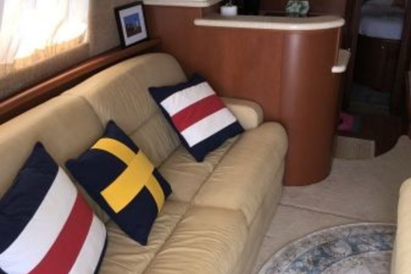 The 43 Sport Bridge ~ Lady J~ boasts one of the largest flybridges of any boat in her class. With her ample seating and wide foredeck, her spacious bridge provides all the room and comfort you need to cruise and entertain in style. Silverton's SideWalk, a unique set of molded steps connecting the bridge to the foredeck, makes access between both safe and convenient whether you're underway, anchored or handling lines. Inside, you'll discover two private staterooms and two full heads complemented by a plush salon finished in fine cherry wood and a full-amenity galley. A wealth of additional features like solid Corian countertops, designer fabrics and a 20" flat-screen TV provide you comfort aboard this beautiful Sport Bridge!