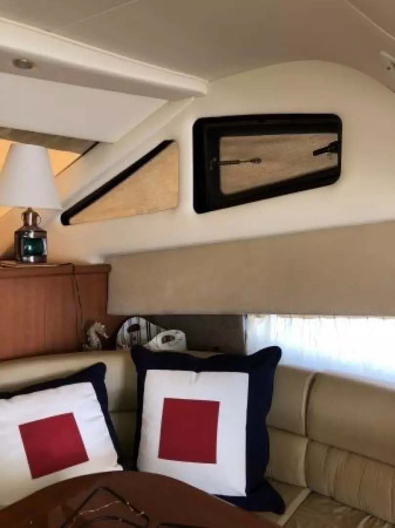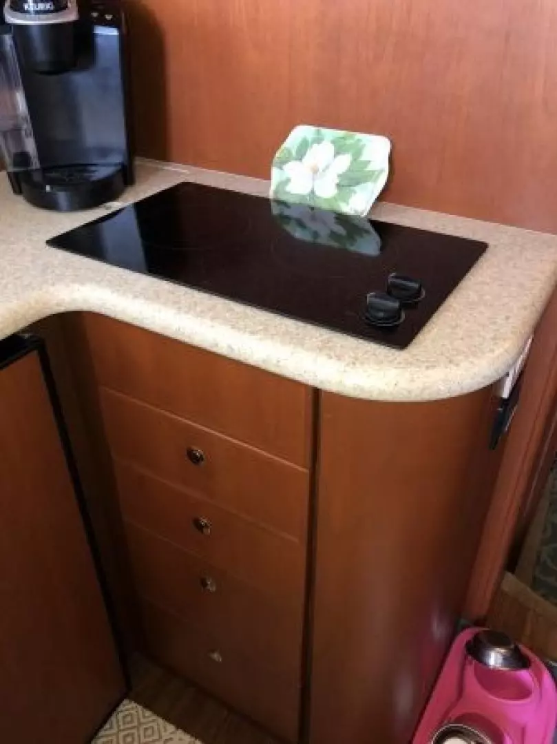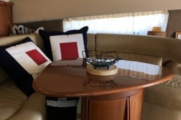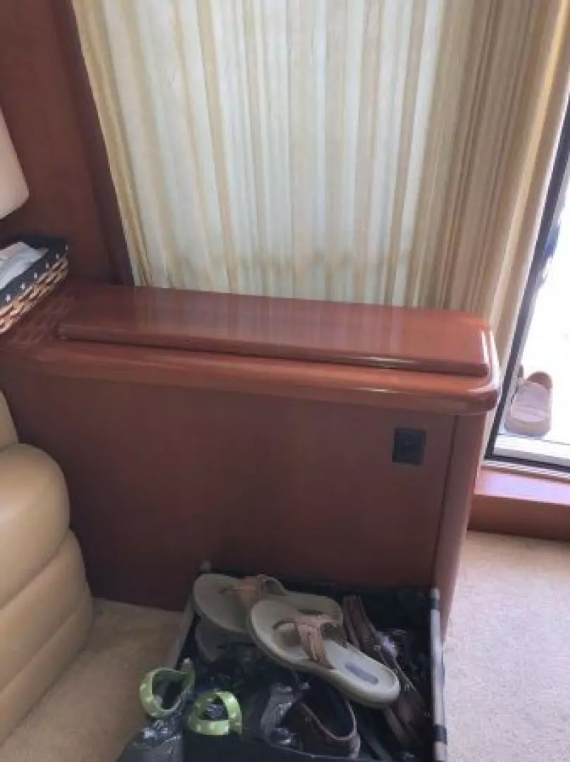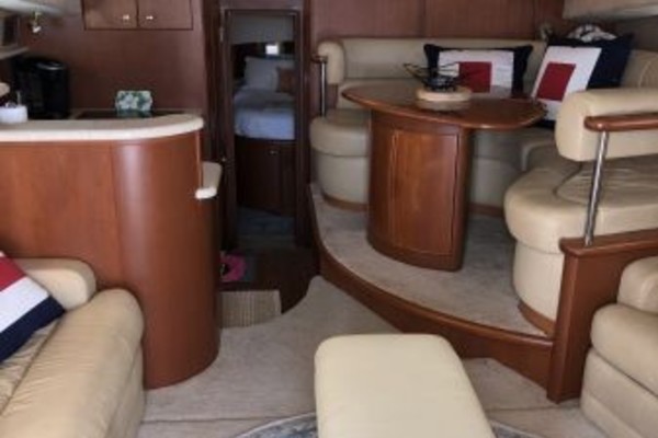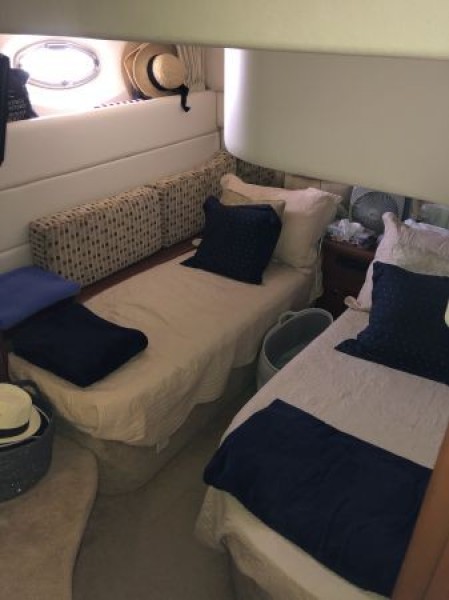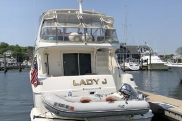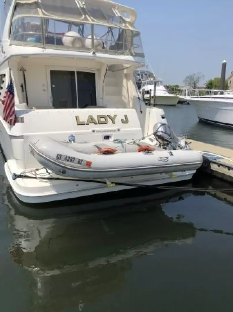 The 43 Sport Bridge ~ Lady J~ boasts one of the largest flybridges of any boat in her class. With her ample seating and wide foredeck, her spacious bridge provides all the room and comfort you need to cruise and entertain in style. Silverton's SideWalk, a unique set of molded steps connecting the bridge to the foredeck, makes access between both safe and convenient whether you're underway, anchored or handling lines. Inside, you'll discover two private staterooms and two full heads complemented by a plush salon finished in fine cherry wood and a full-amenity galley. A wealth of additional features like solid Corian countertops, designer fabrics and a 20" flat-screen TV provide you comfort aboard this beautiful Sport Bridge!