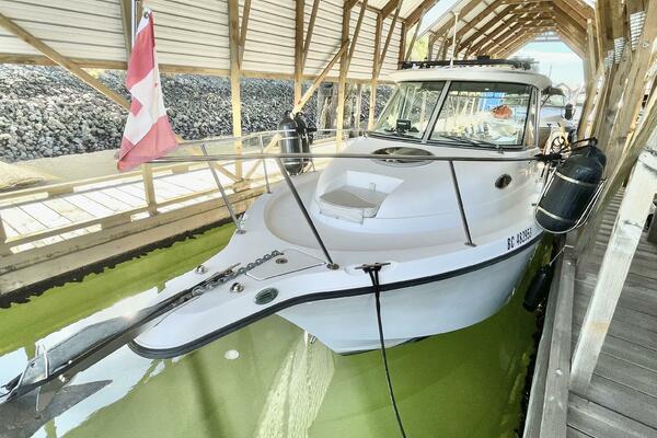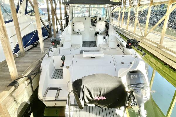 On deck, anglers will appreciate the huge cockpit, hardtop with enclosure and sliding windows, and a Yamaha 9.9 hp kicker with Panther wireless steering for trolling. Down below, the cuddy cabin comfortably sleeps two and features a marine head.