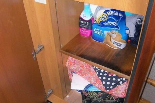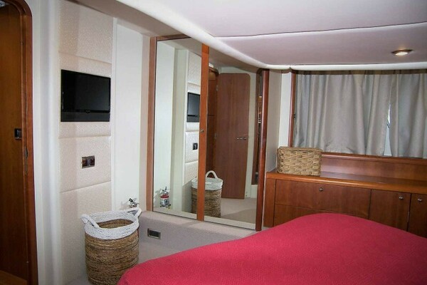 Furthest forward is a very large two mirrored door hanging locker with auto light and a cedar lining. On the forward bulkhead is a 20” TV built into the bulkhead.