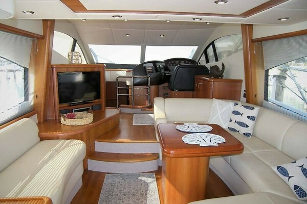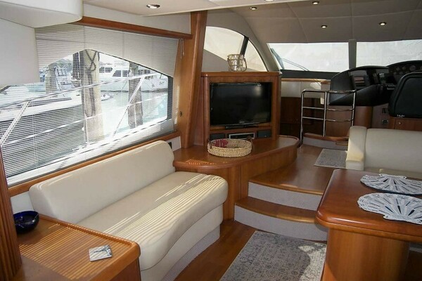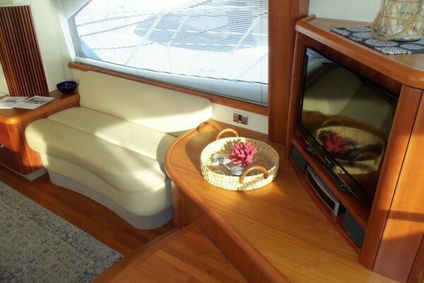 Entering from the Aft Deck/Cockpit via sliding stainless steel trimmed doors is the open Salon with a large settee to starboard, a small settee to port, the yacht’s Lower Helm to starboard and open lower Galley to port.