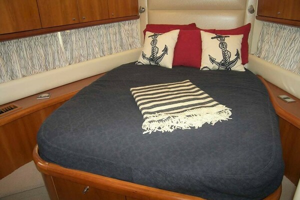 All the way forward is the spacious VIP Cabin with a centerline pedestal berth, padded headboard, twin reading lights and two large drawers at the foot of the berth. Built-in cabinetry serves as port and starboard nightstands. Padded ledges serve to retain the drapes that cover the single port and starboard Bomar stainless steel opening portholes.