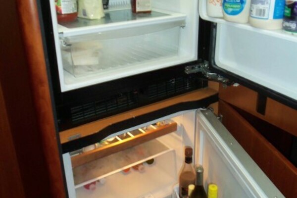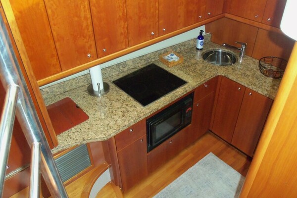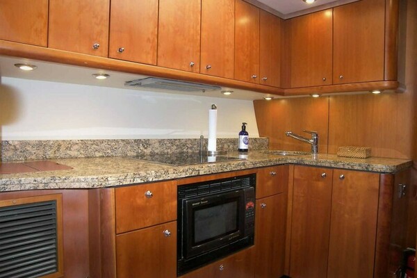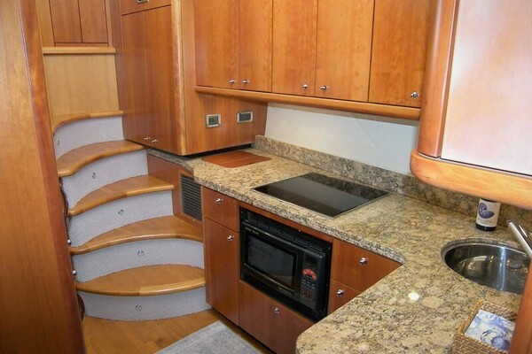The Galley is six steps down and to port but still very open to the Salon as it is aft of and below the forward windshield. The Galley is L-shaped and fully equipped with the following items:
