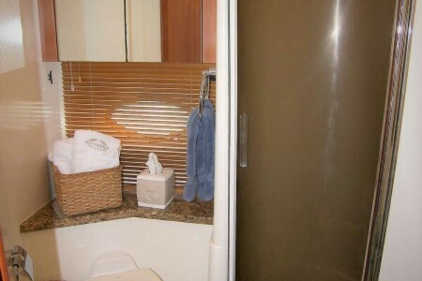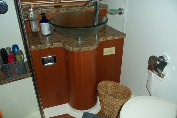 Just one step up and to port is the private Master Head. A white China pedestal sink is the centerpiece of the head with two large mirrored medicine cabinet doors above. Between is an opening stainless steel porthole with “Oceanair” cherry mini blinds. The toilet is a Sealand VacuFlush model. The stall shower has a handheld or wall mountable fixture, a light, small seat, an exhaust fan and a semi circular dark tinted acrylic door.