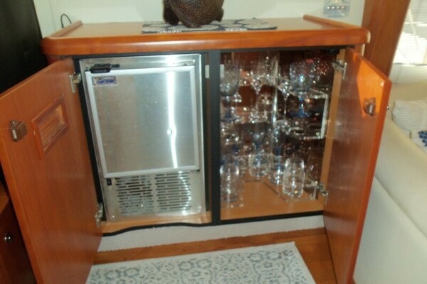Opposite to starboard is a large C-shaped leather settee with a cherry table that can be cocktail size or dining size via a swivel fold out leaf. There is also storage in the base of the table. One step up is a cherry cabinet housing the yacht’s stem and glassware plus a stainless steel Raritan icemaker.