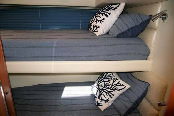 Just forward of the Master Cabin and opposite the galley is the Guest Cabin with twin over/under berths running fore and aft. Each berth has a padded headboard and a reading light.