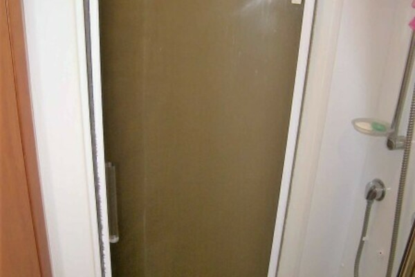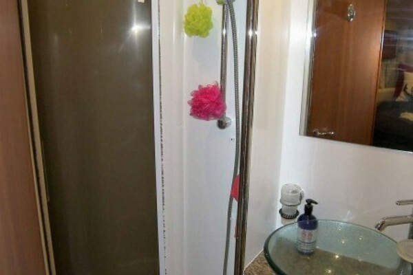 The stall shower has a handheld or wall mountable fixture, a light, an exhaust fan and a tinted acrylic semi circular door. Also in this cabin is an A/C vent, GFCI outlet and three halogen mini spots overhead.