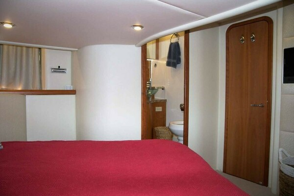 Above is an opening Bomar porthole for ventilation and escape. At the foot of the berth on the starboard side is a 20” LCD TV, and an AM/FM/CD player with remote. Adjacent is an access door to the guest head. To port is a mirrored hanging locker door with cedar lining and auto light.