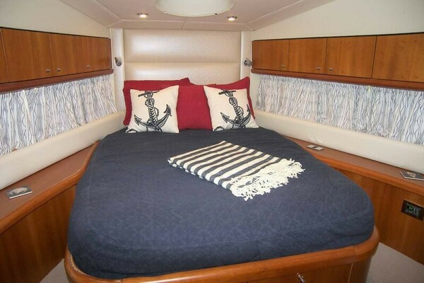The Master Cabin is next aft from the galley and under the forward part of the salon. It features an athwartship queen size berth with two storage drawers at the foot of the berth. The padded headboard has a mirrored section on the bulkhead above plus two reading lights. To port is the entrance to the ensuite head and an AM/FM/CD player with hidden speakers.