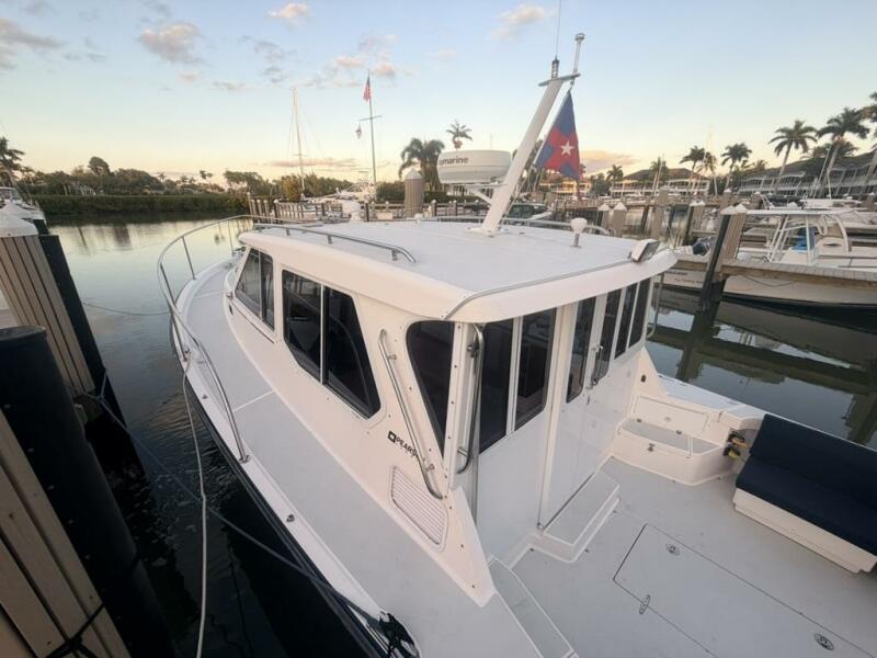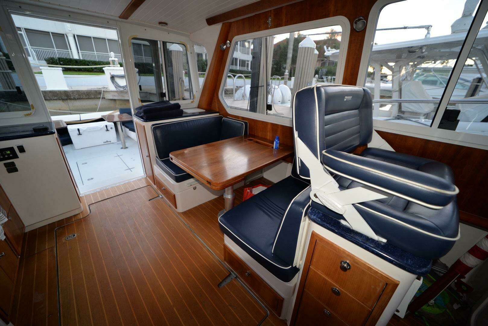 - Pilothouse: Semi-enclosed with aft galley (stove, fridge, microwave), helm station, and convertible dinette