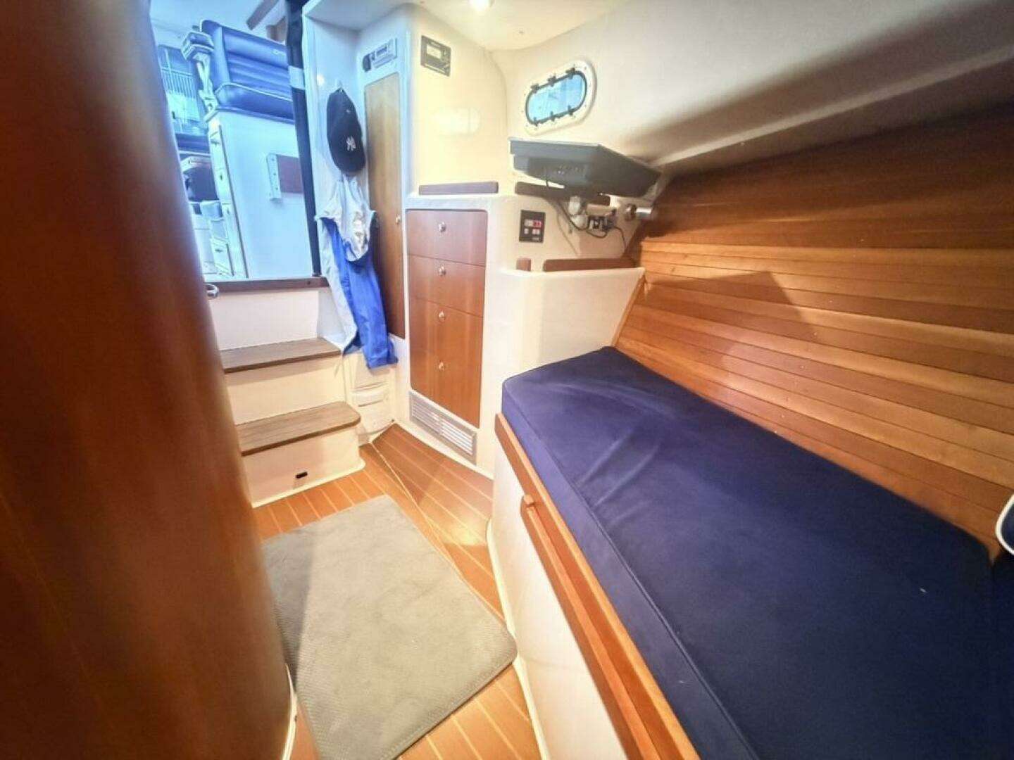 - Master Stateroom: V-berth with an insert cushion to create a large double berth, ample storage, and good ventilation.
