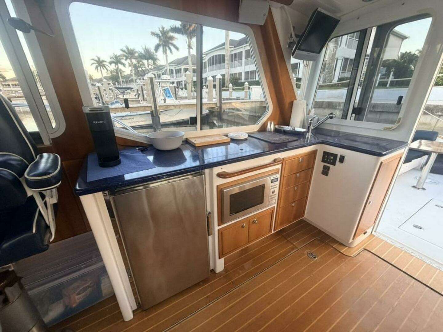- Galley: Located aft and to starboard in the cabin house, it includes an electric stove, refrigerator, microwave, and double-basin sink.