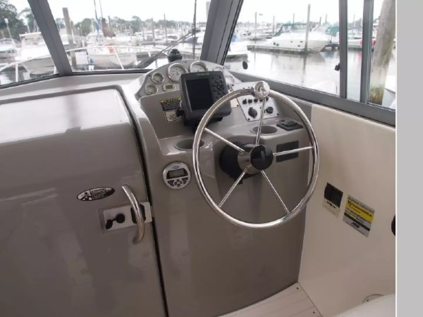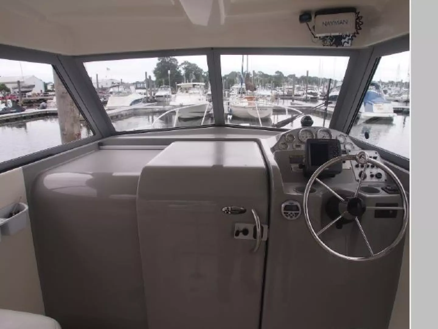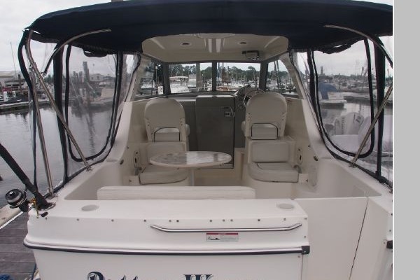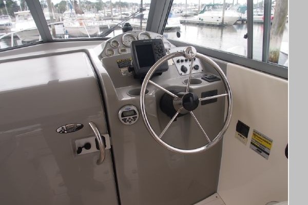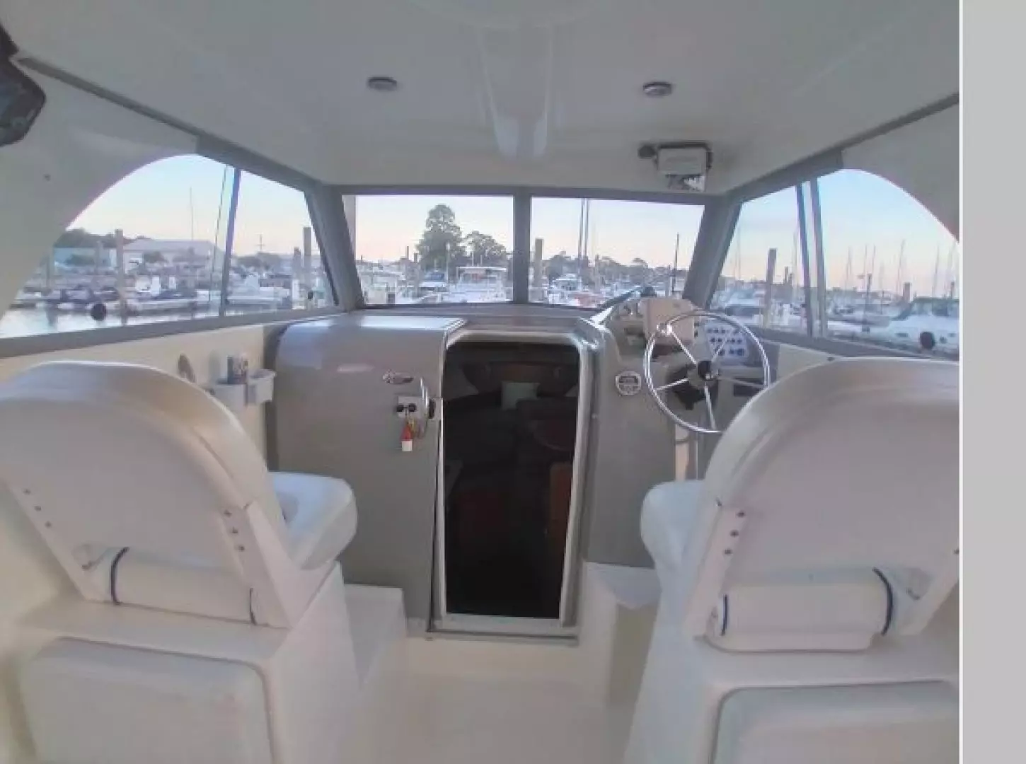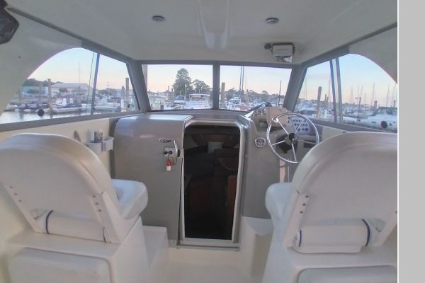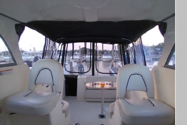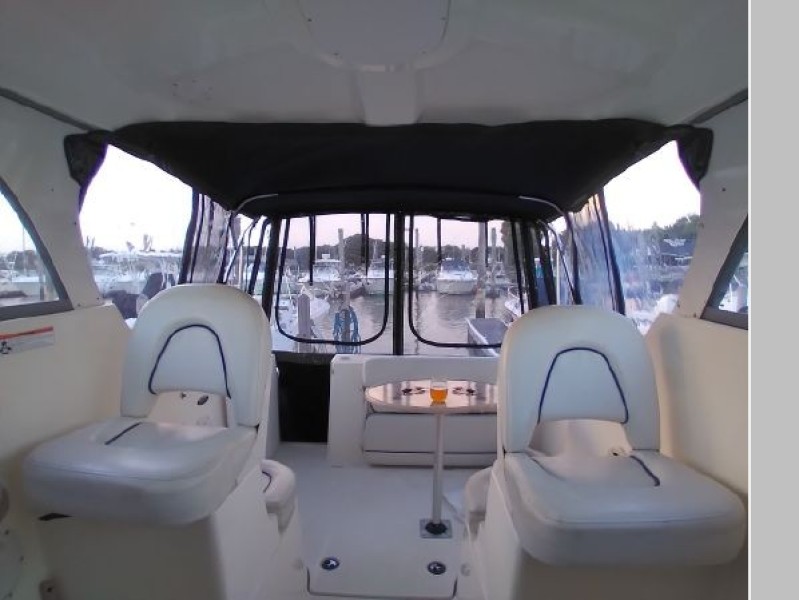 The cockpit is fitted with beverage holders, courtesy lights, engine access hatch with gas assist, hard top with full canvas enclosure for protection from the elements. Great visibility at the helm with a nicely layout instrumentation panel equipped with a Garmin GPS chart plotter.