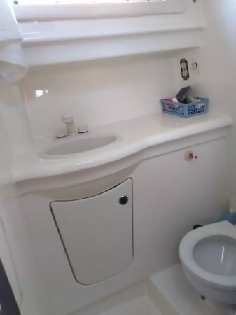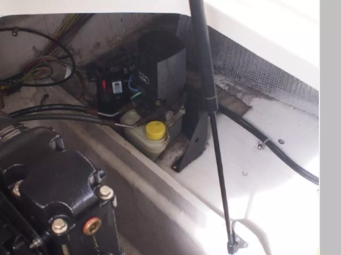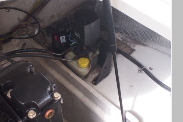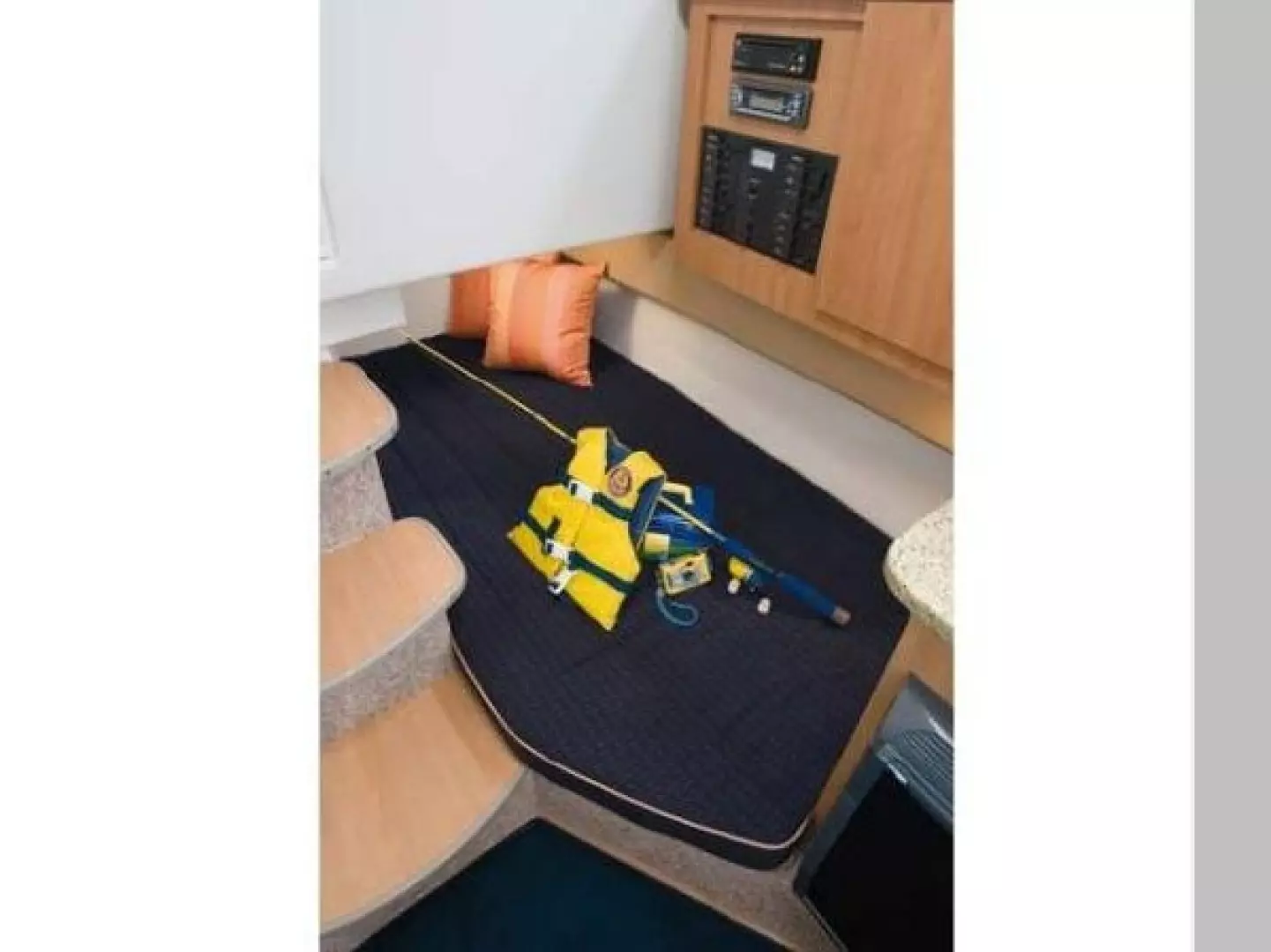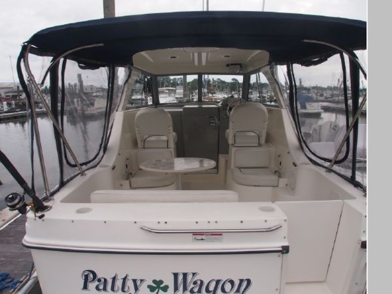 The cockpit is fitted with beverage holders, courtesy lights, engine access hatch with gas assist, hard top with full canvas enclosure for protection from the elements. Great visibility at the helm with a nicely layout instrumentation panel equipped with a Garmin GPS chart plotter.