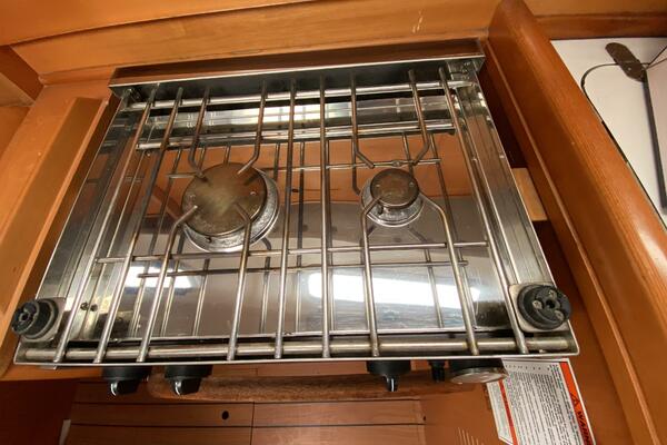 2-burner gimbaled stainless steel propane stove with propane locker in the cockpit.