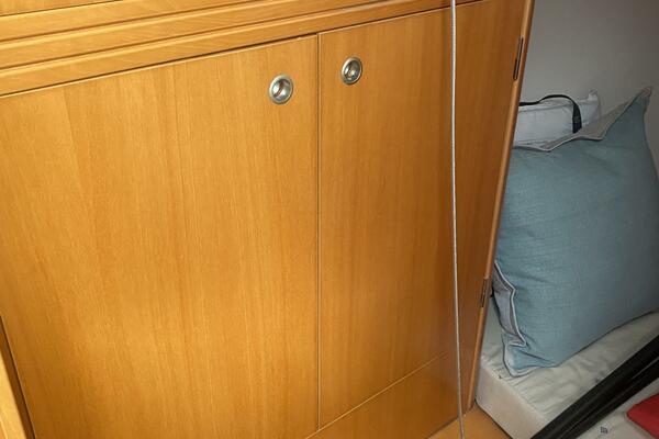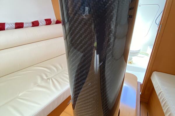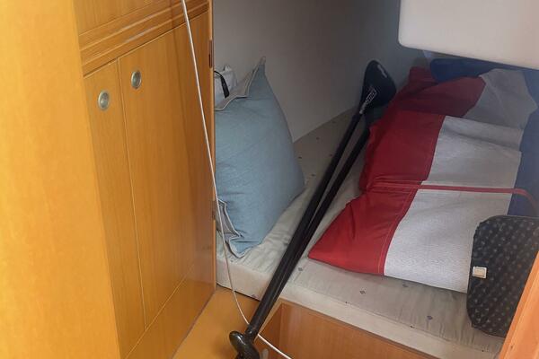 Owner’s enclosed cabin starboard aft, port aft quarter berth, head compartment forward and L-shaped galley to port.