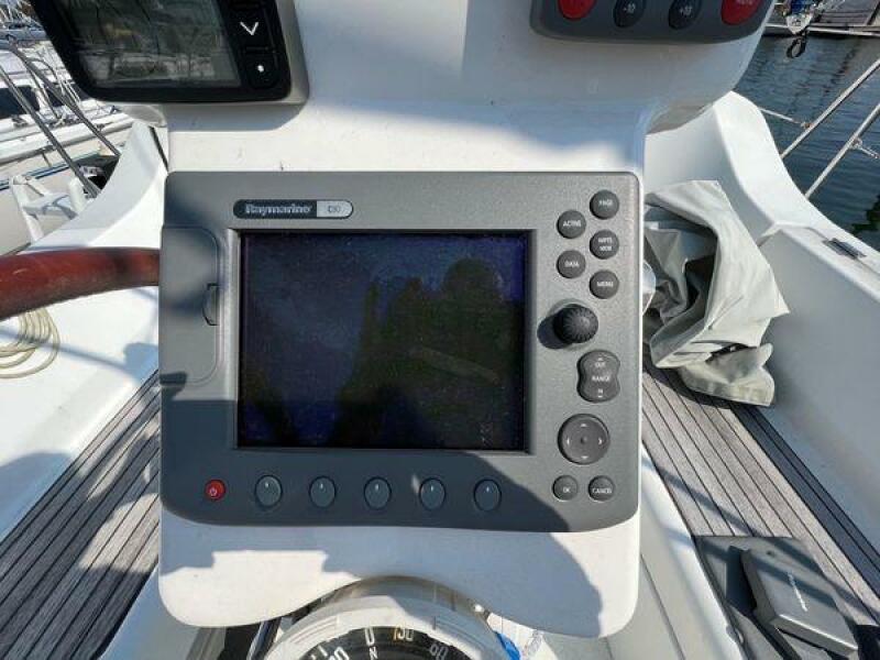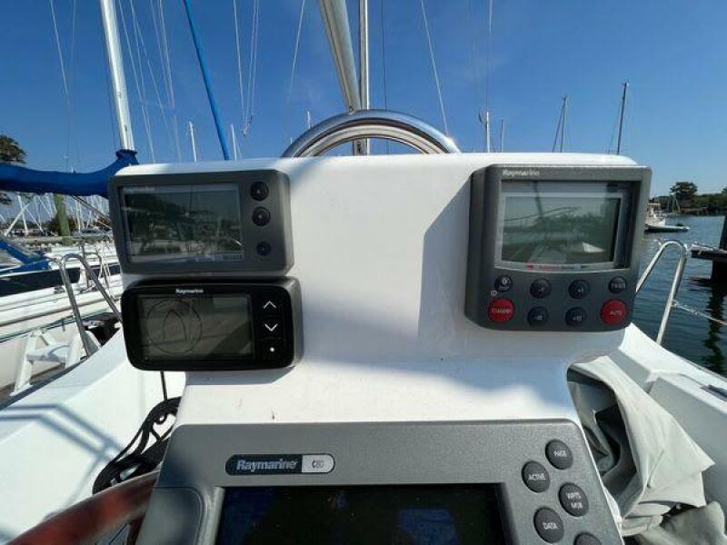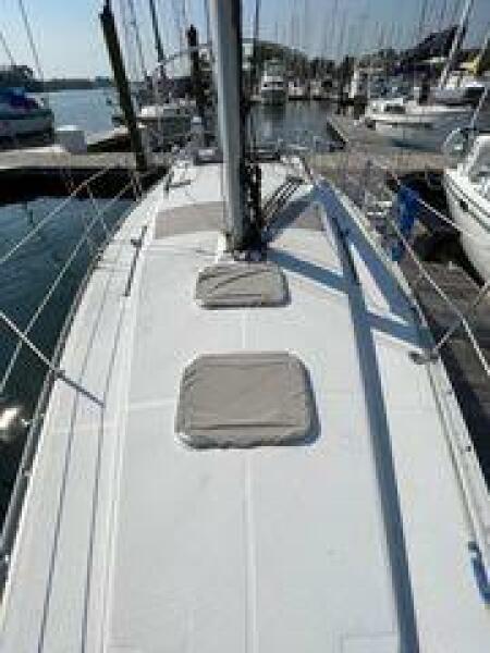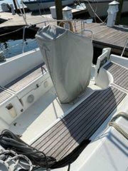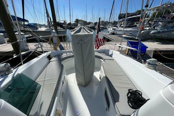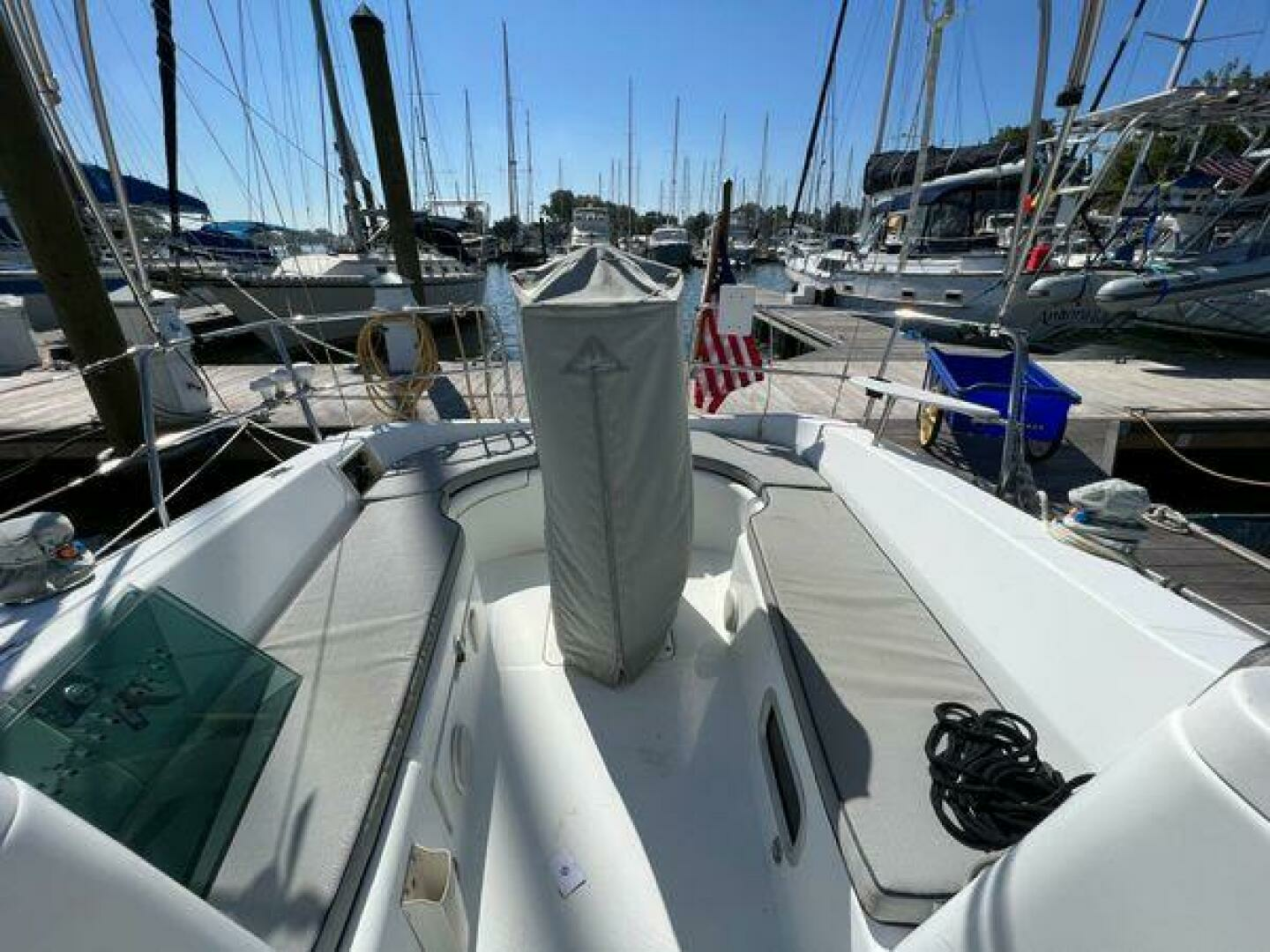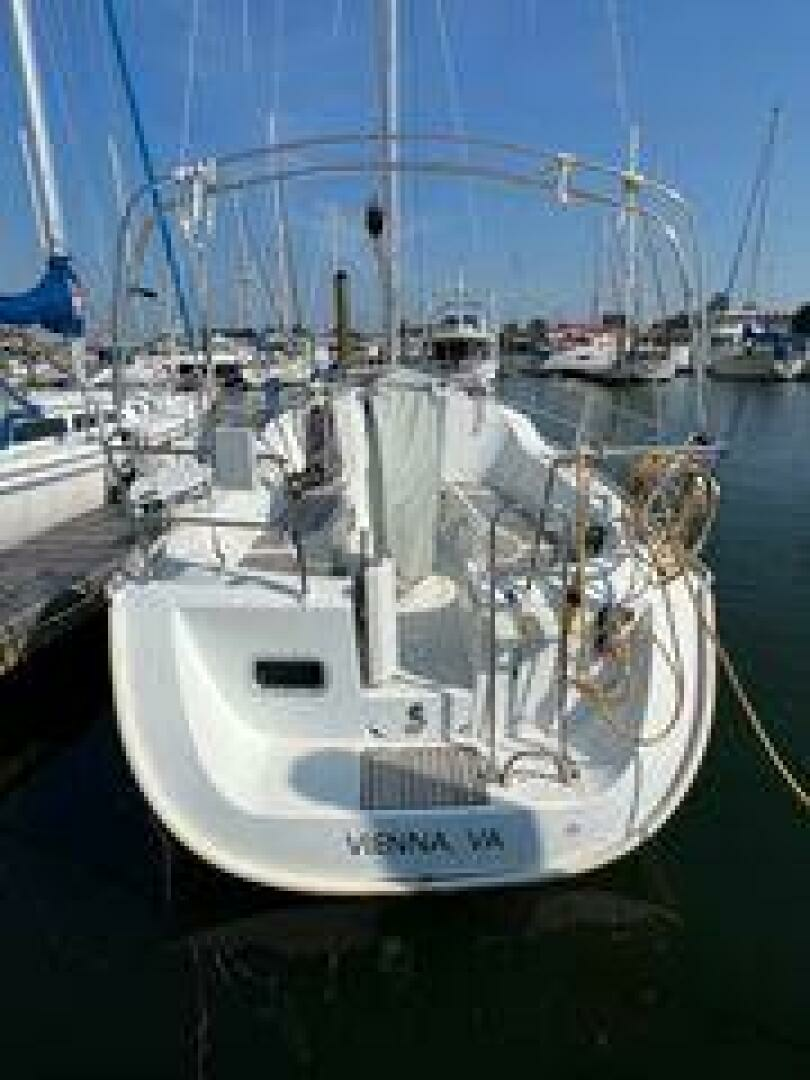 Her cockpit is very comfortable and has cockpit cushions. Her decks are clear and uncluttered allowing easy access to the foredeck. Her walk-thru transom is great for boarding from a dinghy or just swimming while sitting on the hook. The 323 makes for a wonderful performance cruiser in a perfect size that will not overwhelm and is easily single handed.