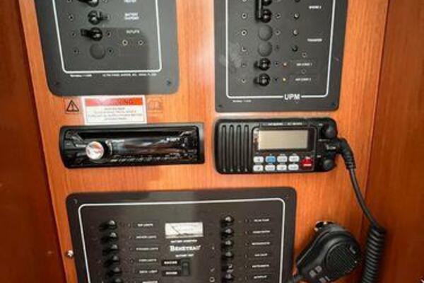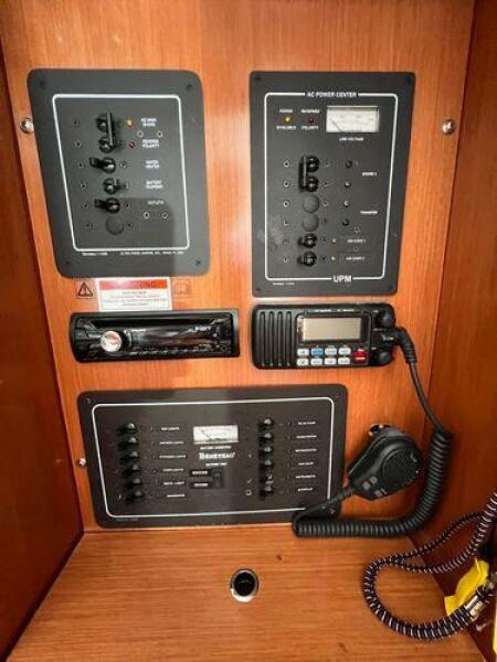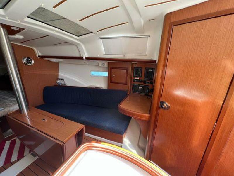 Going aft you enter the main salon. Here she has a fixed centerline table with large leafs for dining on both sides. Navy cushions add warmth as well as the wood accents in the cabinetry. Storage outboard and behind the seat back cushions. Aft facing navigation station on starboard. Faux teak and holly sole add warmth as well but also is a breeze for cleaning and maintaining.