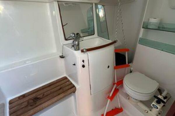 Her L-shaped galley gives one all they need for day trips or extended cruising. There are plenty of shelves outboard as well as counter space for food prep.