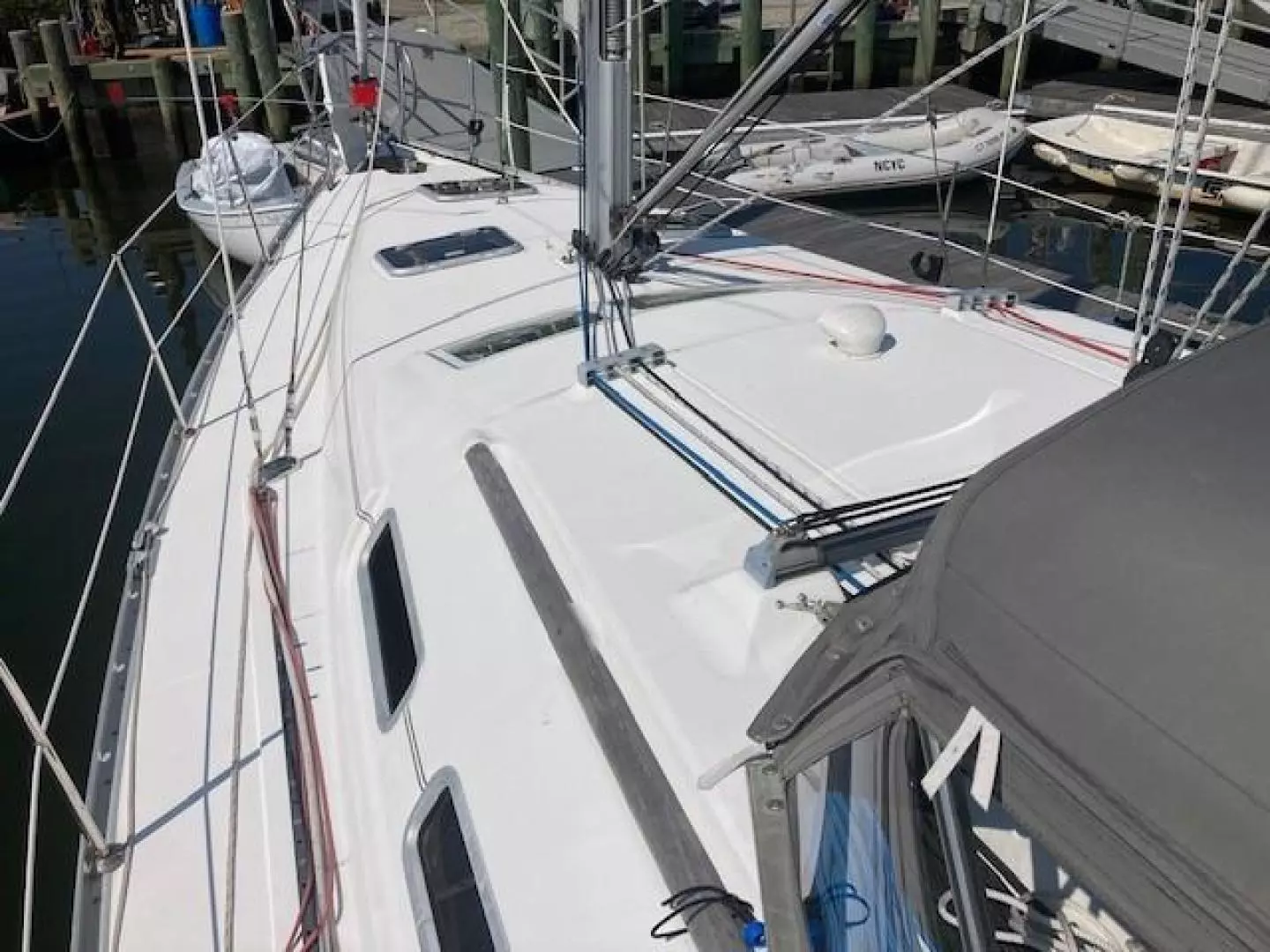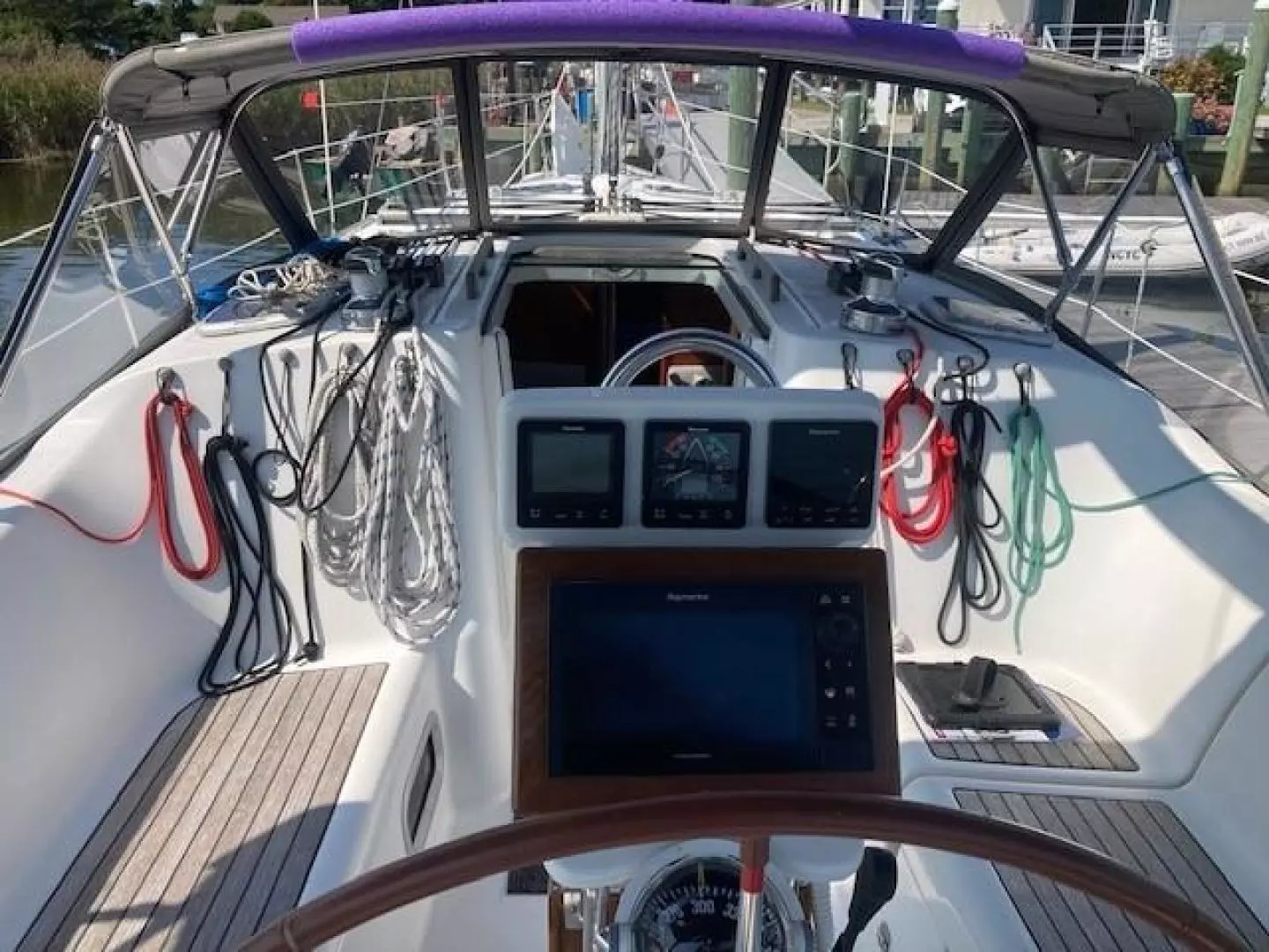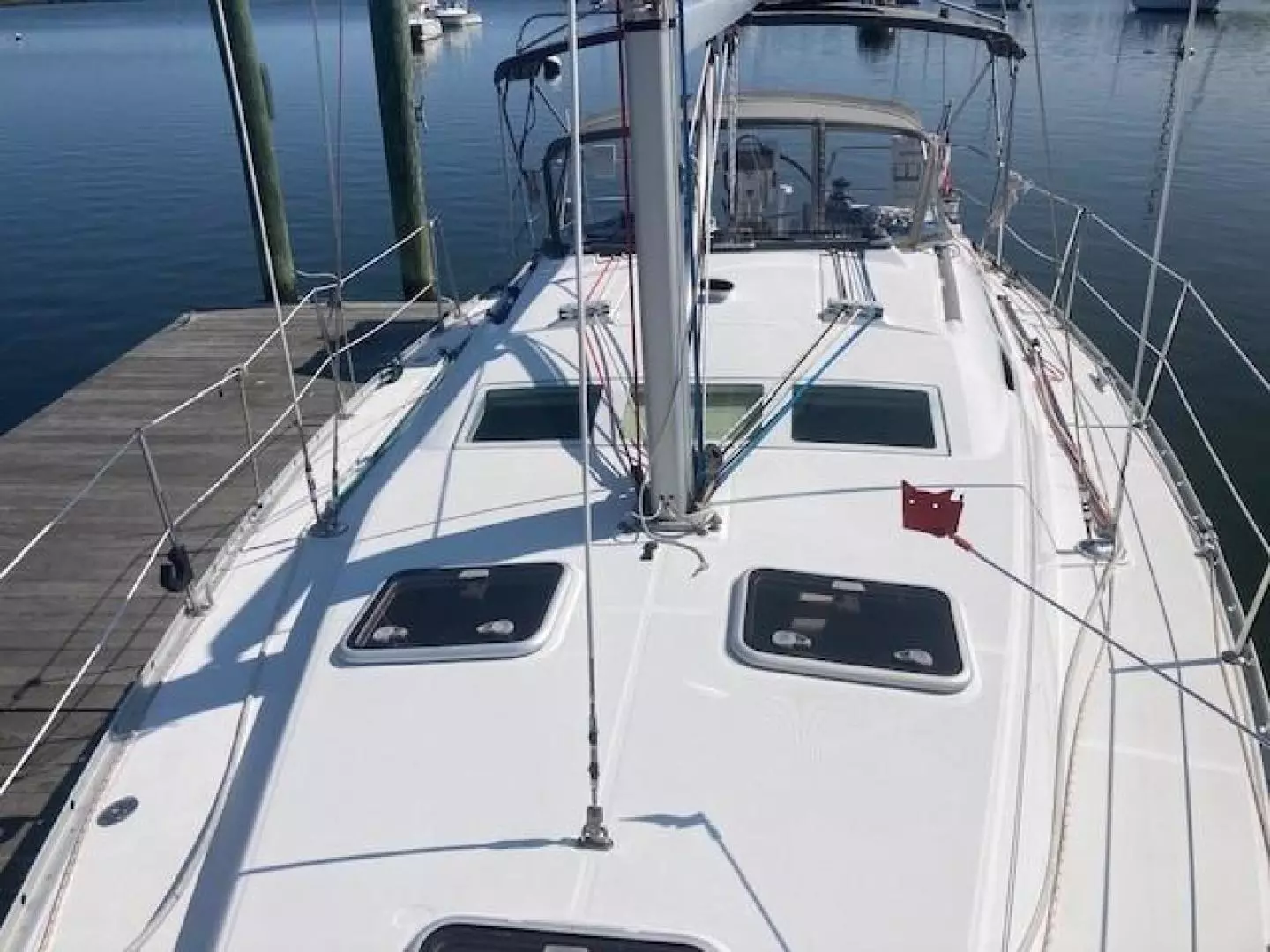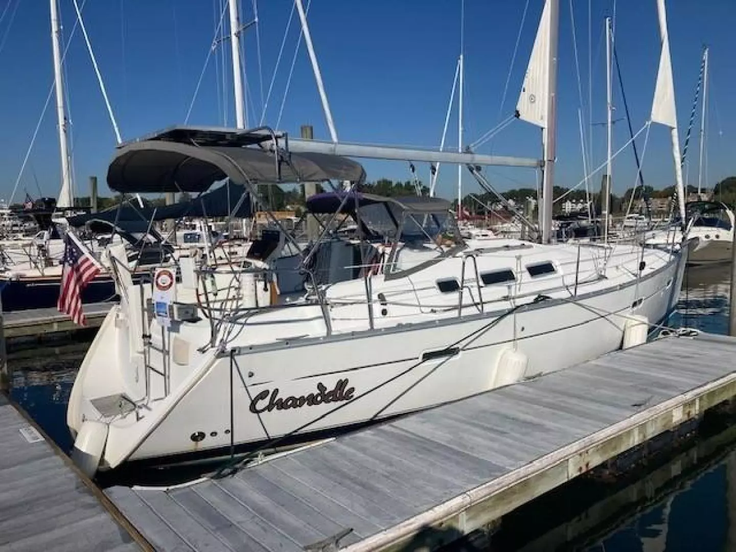 Only two owners since new, Chandelle is a very nice example of the Beneteau 373 which won Cruising World’s Boat Of The Year Best Value award when introduced in 2004. It’s an impressive design featuring two panoramic forward facing windows that bring plenty of light into the spacious interior that’s bright and airy with extra headroom. She has two large cabins, a nice salon, a spacious galley and a large private head with stall shower. The roomy cockpit has a dodger and Bimini top (with solar panel on top) and an innovative pivoting steering wheel that provides easy access from the helm to to companionway.