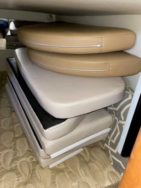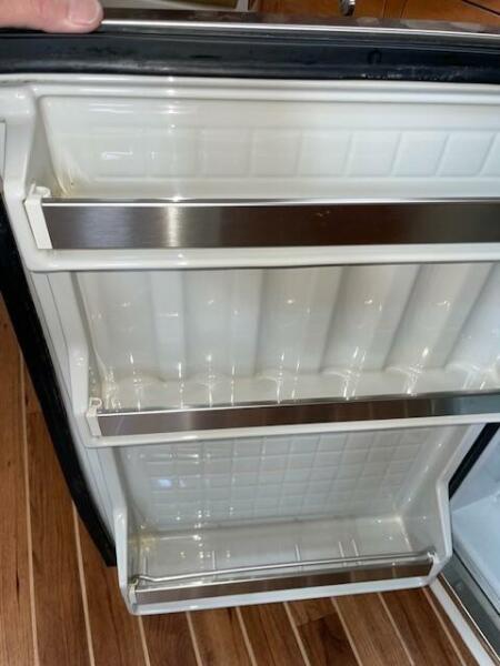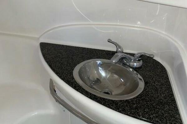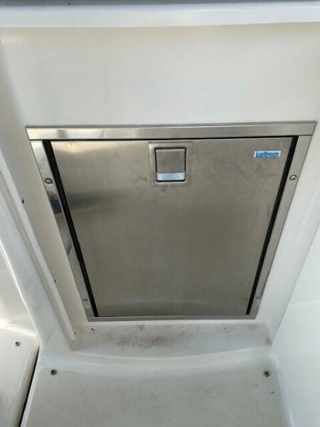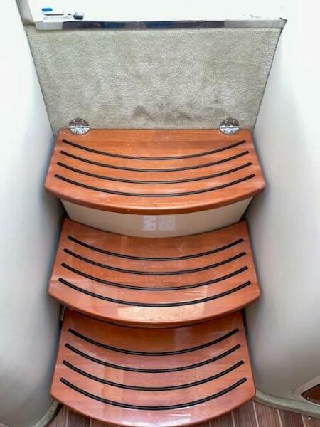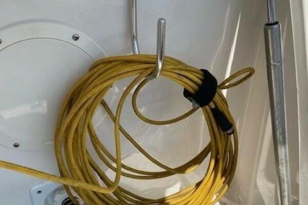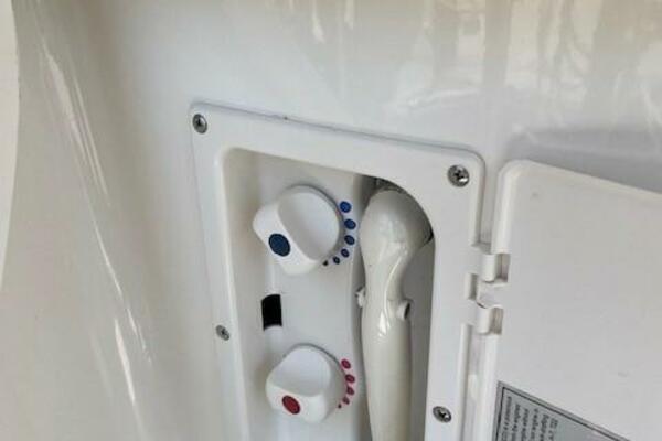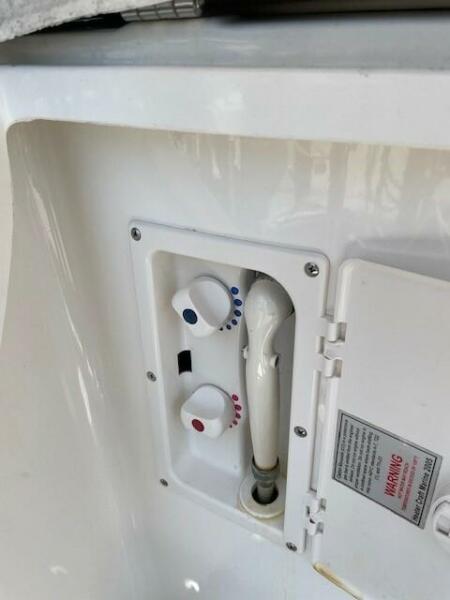 Boarding the boat at the large deep swim platform, you immediately notice the two transom lockers. Starboard has connections and storage for the 30 amp shore power cord plus cable TV hookups. There is also a washdown with hose stored there. To port is a roomy line locker which also houses a hot and cold hand-held cockpit shower.