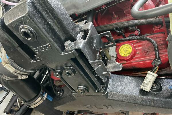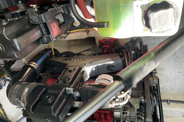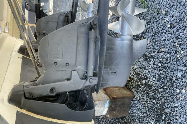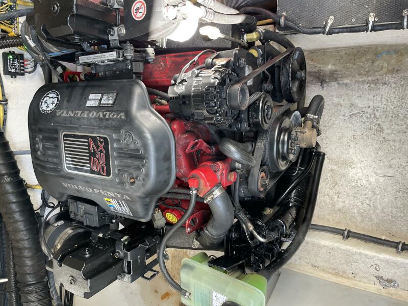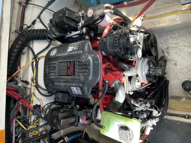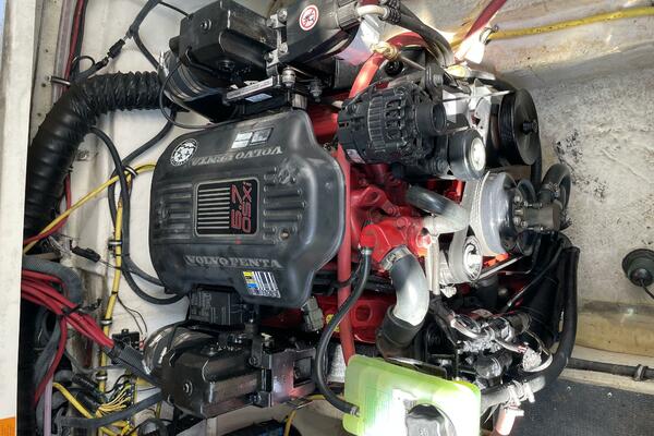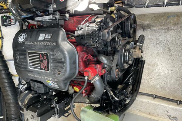 She's powered by twin Volvo 5.7 L MPI gas engines, putting out 320 hp each. They currently have approximately 290 hours on them. They are fresh-water cooled. The drives are the upgraded Ocean X series duoprops.