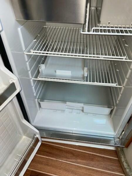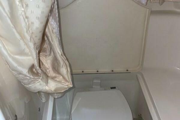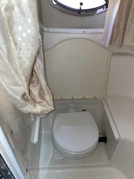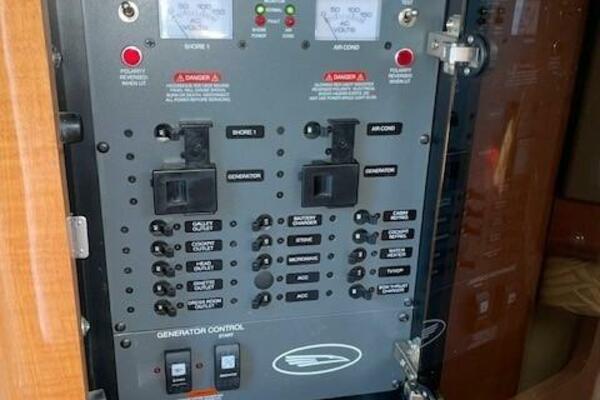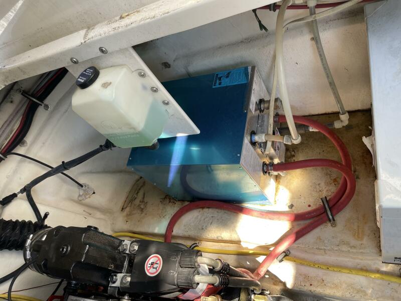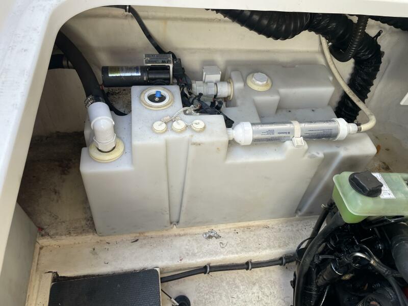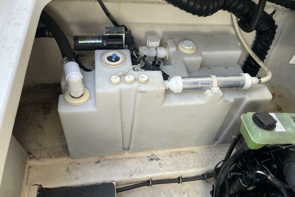 The machinery is located beneath the cockpit floor via an electric hatch that raises the back deck. The switch is conveniently located at the dash. There is ample room forward of the engines to drop in and access all of the major service items. On the port is the hot water heater and generator. To starboard is the vacuflush head pump and holding tank. Forward are easily accessible pumps and valves and the Halon automatic fire extinguisher.