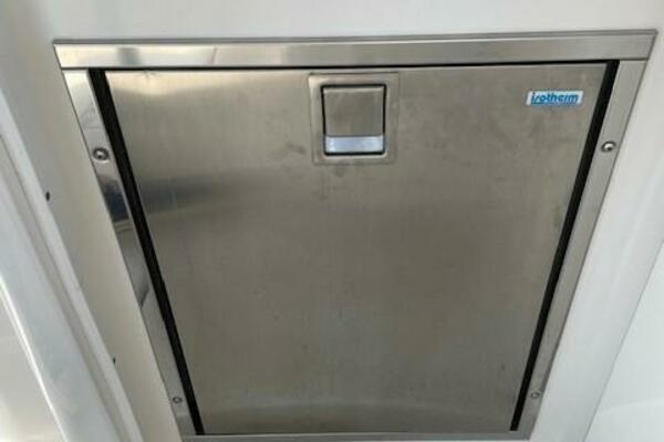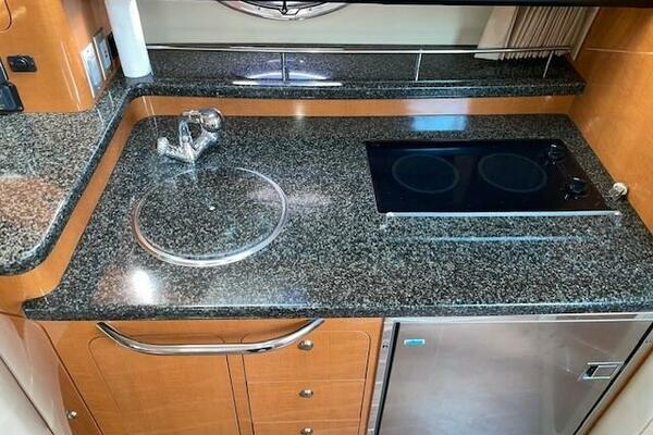 Moving forward, she has a centerline transom door which accommodates C-shaped opposed seating creating a social space for the whole crew, plus a removeable dining table to starboard. To port is also a cockpit wetbar featuring a sink, storage and a cockpit fridge.