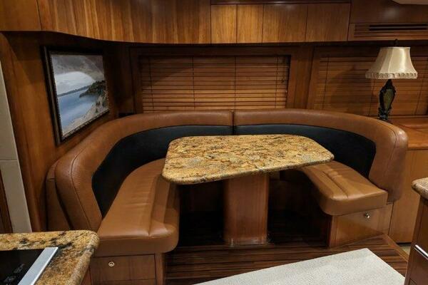 Entering the beautifully decorated salon, you'll immediately sense the massive feel to this area. Surrounded by a beautiful satin-finished cherry wood throughout and large windows, makes this a very open setting. To port, an oversized U-shaped plush leather sofa, which houses storage on both sides, accented by a beautiful custom wood table. To starboard you'll find the entertainment center which houses a flat screen TV.