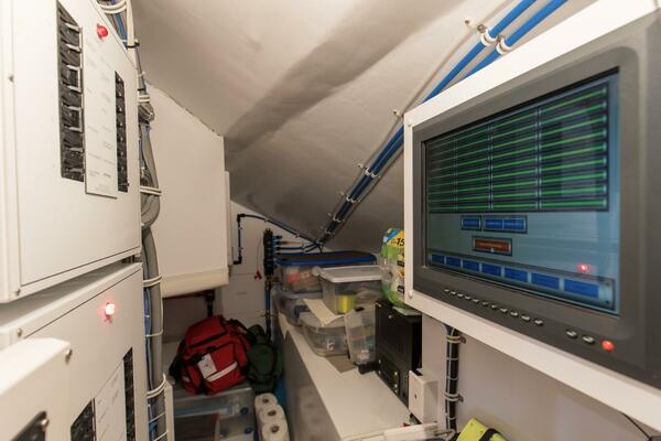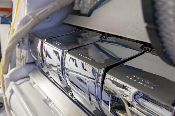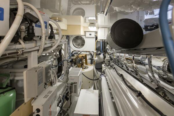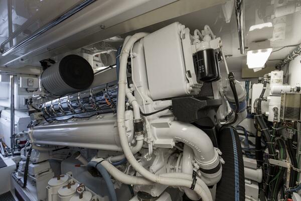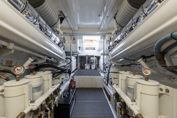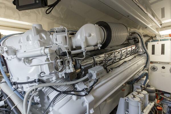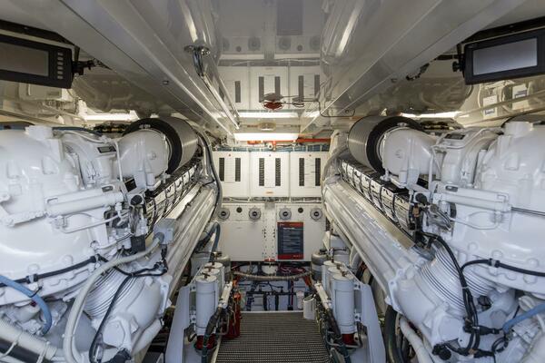 The engine room provides easy access to equipment and the bilges are painted with high gloss urethane paint for ease of cleaning. A forced air induction system draws cooling air for the engine room from underneath the cockpit gunwales, reducing saltwater intrusion into the engine room.
