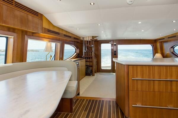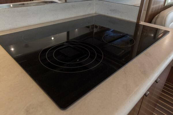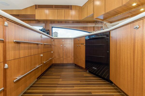 One step up from the galley you'll find several deep storage drawers and a surplus pantry just forward of both the dinette and galley. There are four under counter sub-zero refrigerator drawers and one freezer unit located in starboard brow attic, Corian galley counter tops and backsplashes, microwave convection oven, four burner ceramic cooktop and to starboard a large u-shaped dinette, all highlighted with Satan flat panel African Mahogany cabinetry.