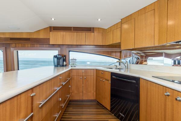 “REFUGE” features African Mahogany interior wood with a touch of classic eloquent soft good for a sophisticated touch. As you enter the salon door, the 21'6" beam provides for an expansive salon. A U-shaped sofa to port with storage underneath provides plenty of seating and storage for offshore tackle. To starboard, a 42" smart TV is neatly tucked into the bulkhead and connected to the onboard surround sound system. To provide additional protection, a full carpet runner covers the high traffic areas of the salon.