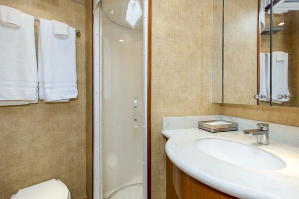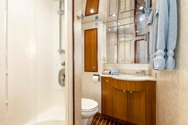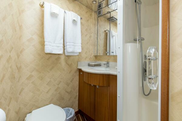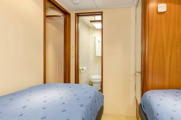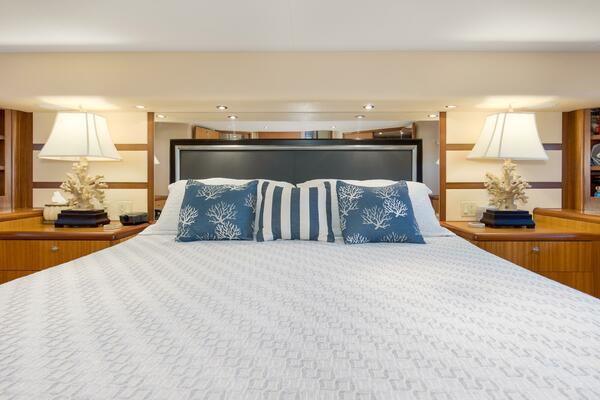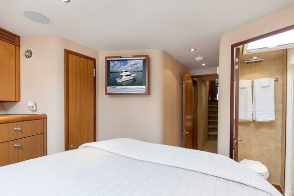 Hatteras Yachts vintage 68’ enclosed bridge is one of the only true full beam master stateroom available in the market. The 21'6" beam provides an expansive area featuring a king-size berth, twin nightstands, dressers to port and starboard and cedar lined hanging locker. Relaxing is easy with a 20" LCD TV, surround sound system Roku TV. For lighting twin oversized portlights provide natural light into this stateroom.
