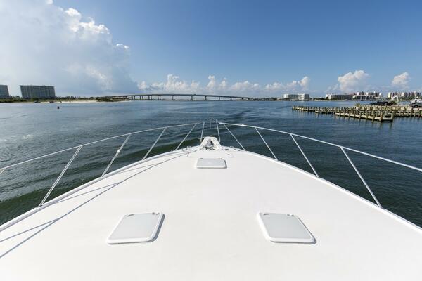 Hatteras Yachts design a yacht with longevity in mind as all stanchions and cleats are through bolted to aluminum backing plates that are encapsulated into solid fiberglass sections of the superstructure. Molded fiberglass UL approved tanks are placed between the stringers and glassed in place. All fuel tanks are constructed with a fire-retardant resin, and exposed surfaces are coated with a fire-retardant intumescent paint. Bulkheads and stringers are fully tabbed into the hull itself, and the stringer system is built of a closed cell polyurethane foam to provide for stiff longitudinal support with no fear of water intrusion.