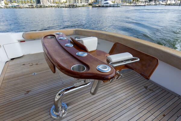 - Teak Release Marine Fighting Chair with offset pedestal and rocket launcher