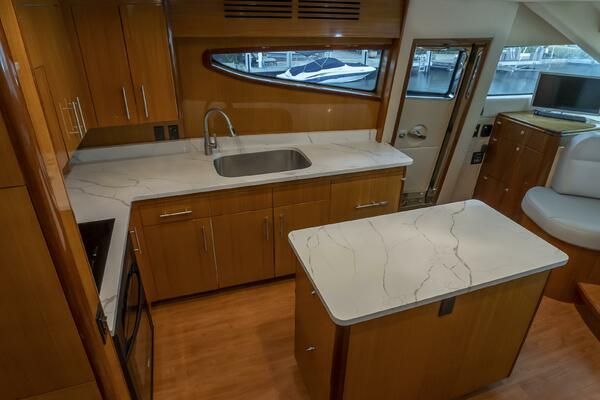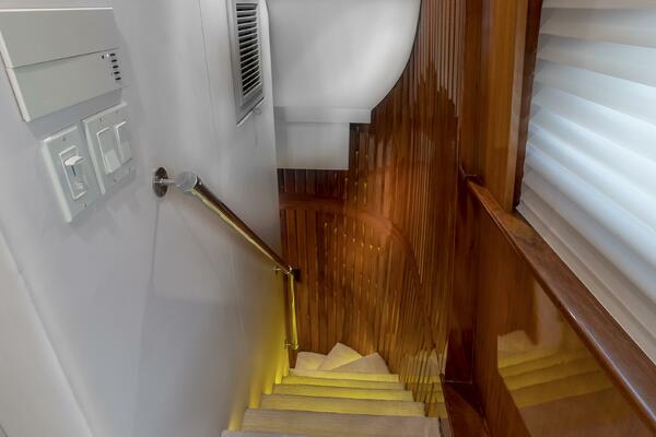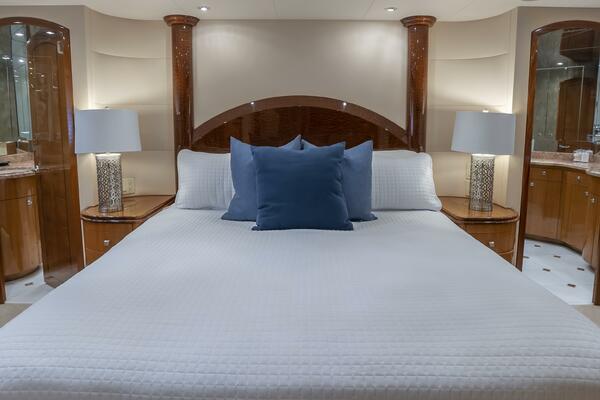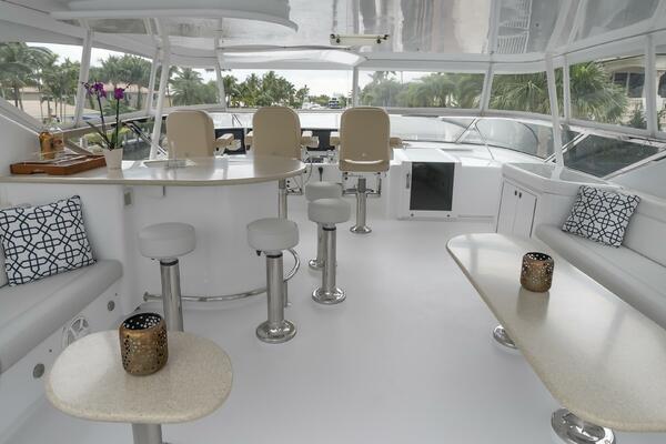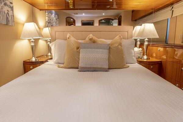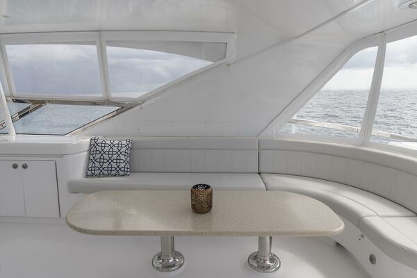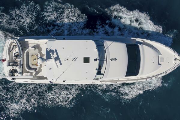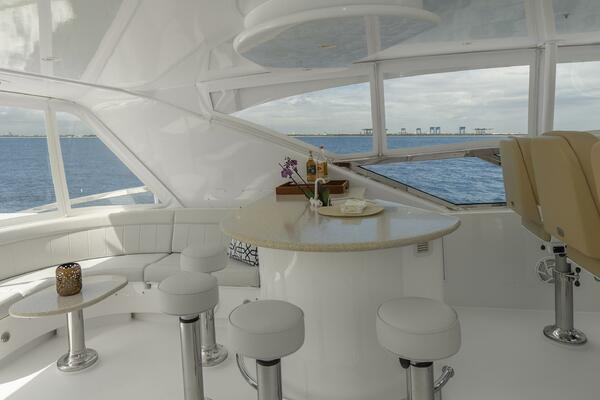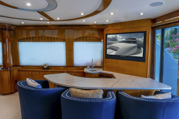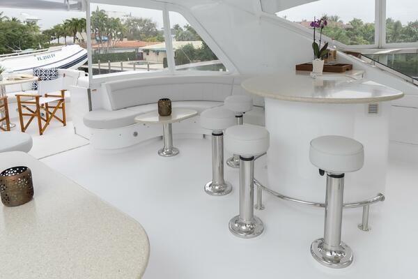 Her spacious flybridge offers panoramic views, a custom hardtop, wet bar, grill, and plush seating — the ideal setting for sunset cocktails or al fresco dining under the stars. Aft, a generous teak swim platform and lounge deck welcome effortless access to the sea, tender, or water toys.