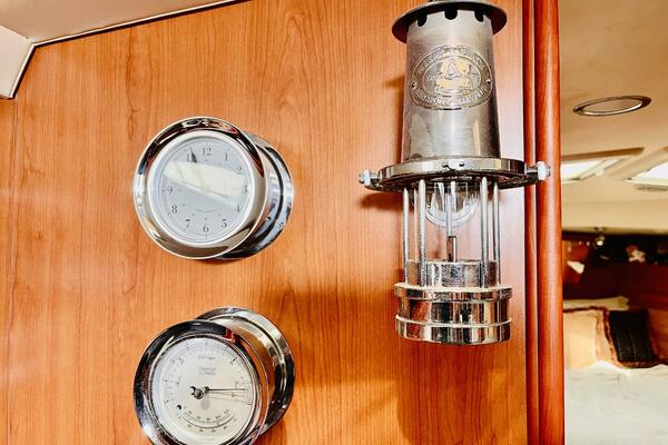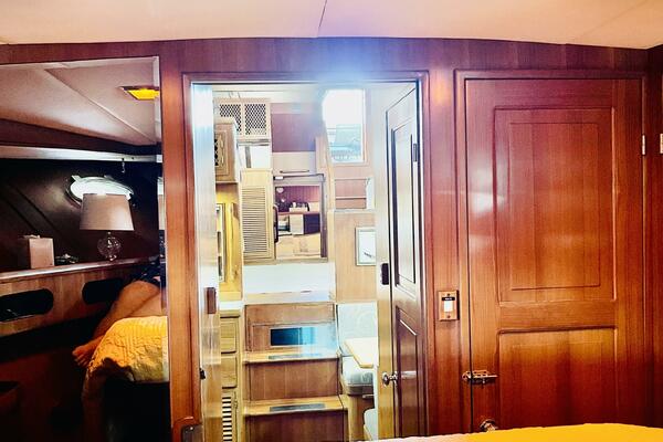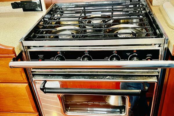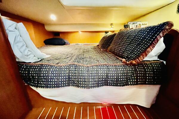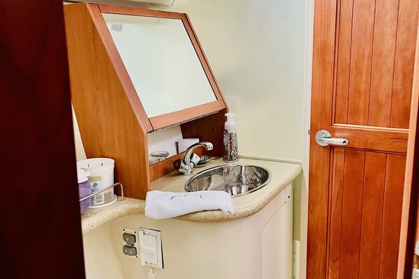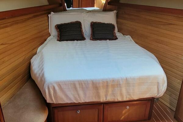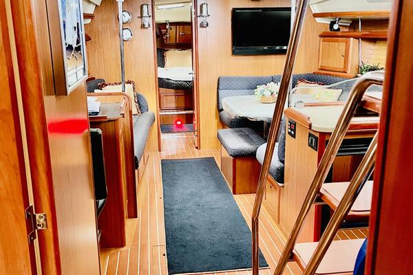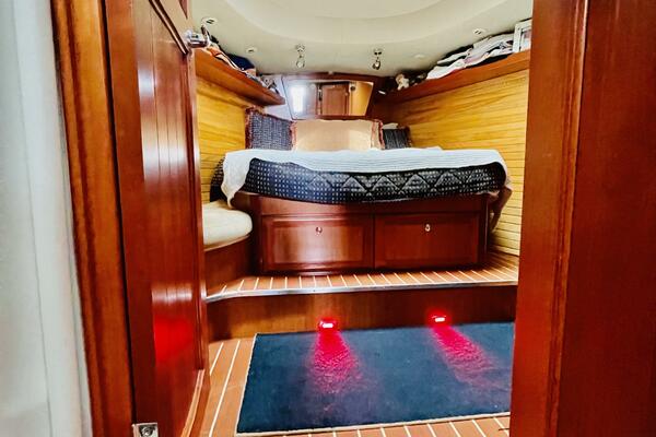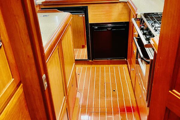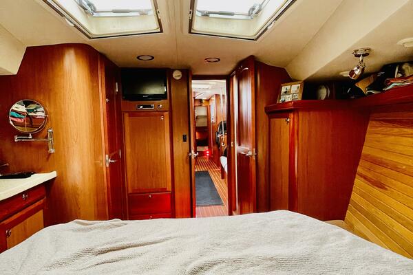 Below-decks you will find she has 6' 9" of headroom, abundant natural light, and the highest quality woodwork and a highly functional extremely spacious layout. With three private cabins, two heads and a separate shower, an enormous salon with a large flatscreen and Bose Surround Sound, and a fully equipped navigation station/office area. The galley is perfect with expansive counter space, a deep double sink, two refrigerators and two large freezers, microwave oven with built in coffee pot, and a stovetop hood with fan over 3-burner propane stove and oven. The master stateroom has a centerline queen, hanging lockers and drawers, and a large shower separate from the head. The aft cabin has a built-in washer/dryer. She would be a great place to work and liveaboard.